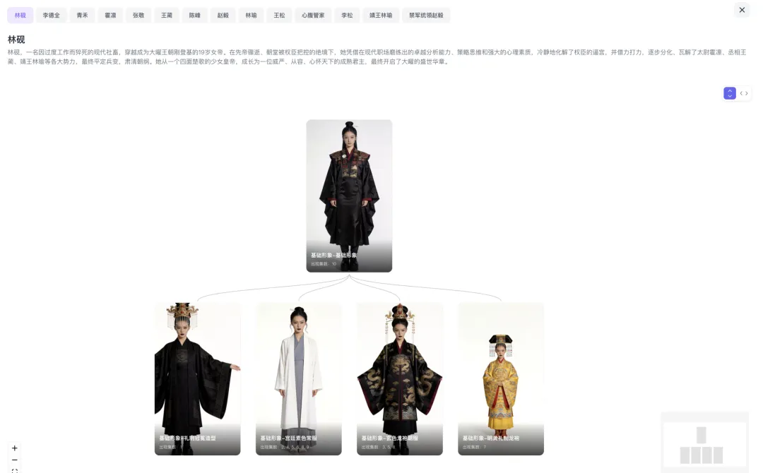 点开角色页面,我发现包括女主、武将、文官、心腹、太监等在内的十几个角色都已经“准备到位”。根据剧本,短剧Agent为女主设计了朝堂衮冕、明黄凤袍、月白色常等多种形象,还贴心地给出了每种造型的出现场次。剧中的丞相形象,则从气宇轩昂的朝堂冠冕到狼狈落魄的阶下之囚,贯穿了角色的整个生命周期。