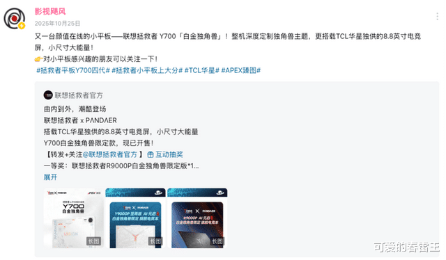 联想拯救者平板Y700四代自上市以来,游戏操控与画质体验的双重优势迅速出圈,斩获市场广泛关注。知名科技内容创作者“影视飓风”更是对其给出“小尺寸大能量”的高度评价。
