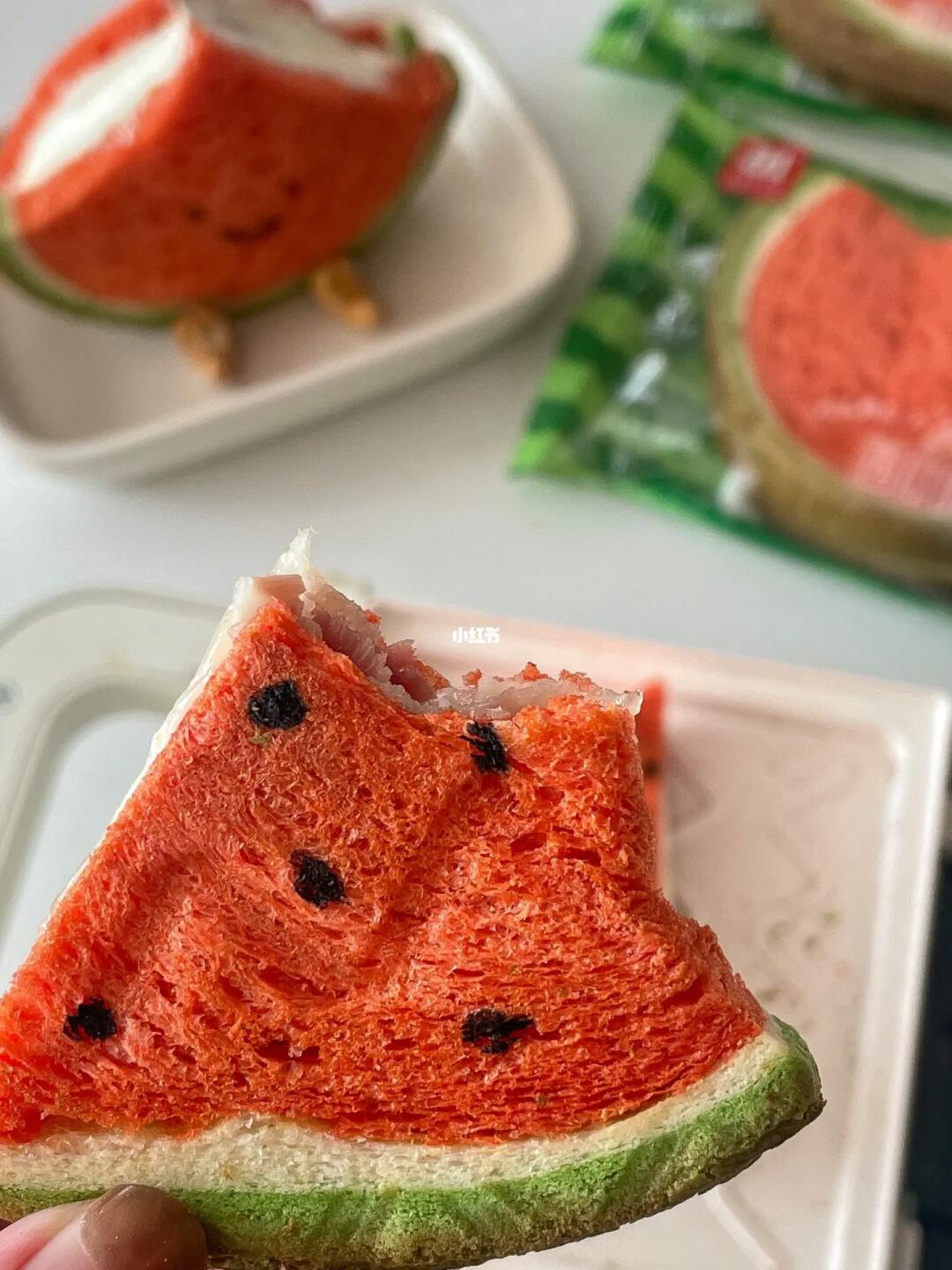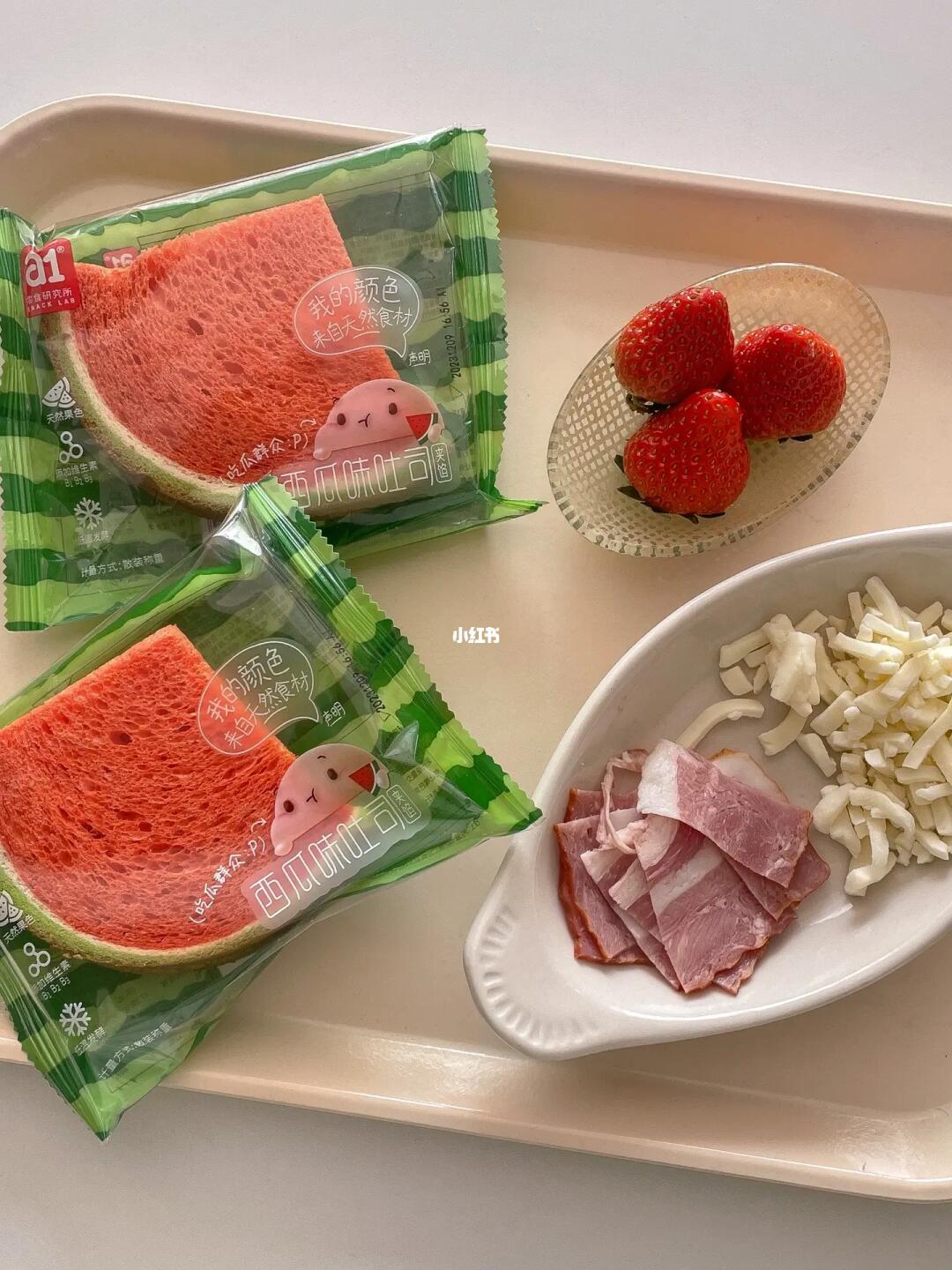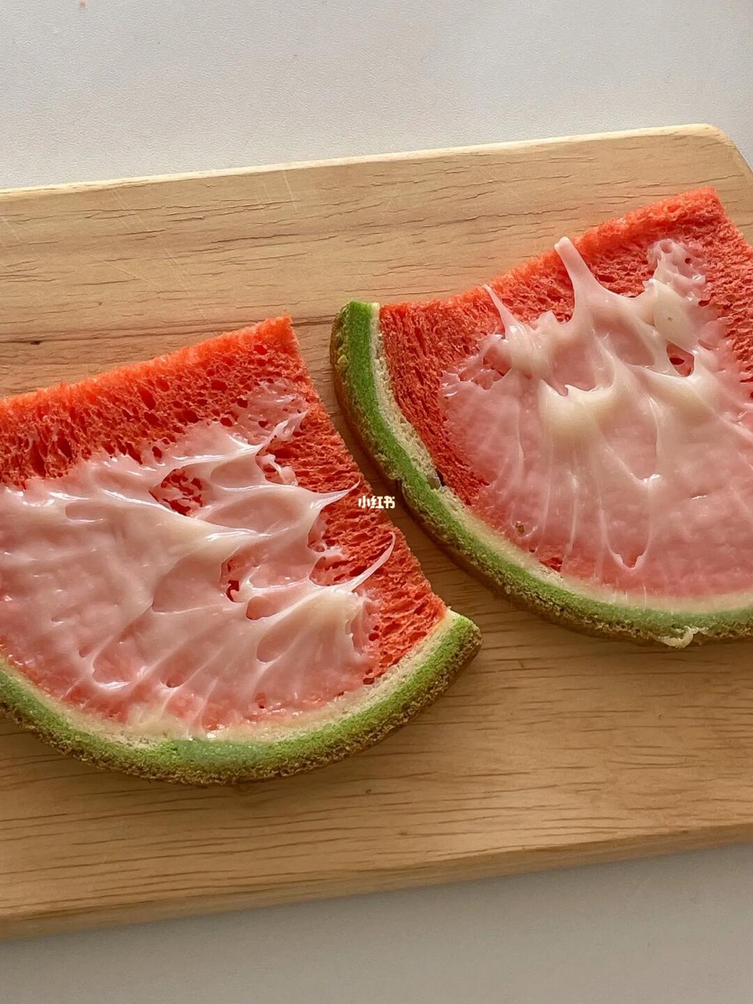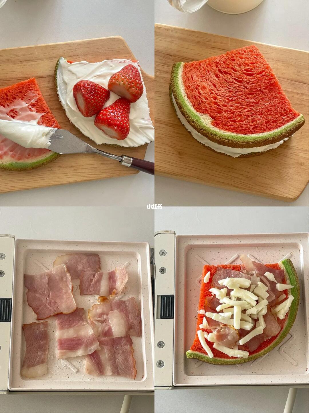 这个西瓜吐司也太“西瓜”了吧 不管是外观还是味道都很还原西瓜本瓜 一打开就有一股淡淡的西瓜味 闻起来很清新 中间夹满了甜而不腻的奶酱 口感就很丰富 - 今天用松软香甜的西瓜吐司做了两个口味的三明治 一款是咸香口的热压🥓培根芝士三明治 压扁后的吐司对半切开 里面的芝士还能拉丝 而另一款是香甜口的🍓草莓奶油三明治 草莓和奶油 双份幸福💗