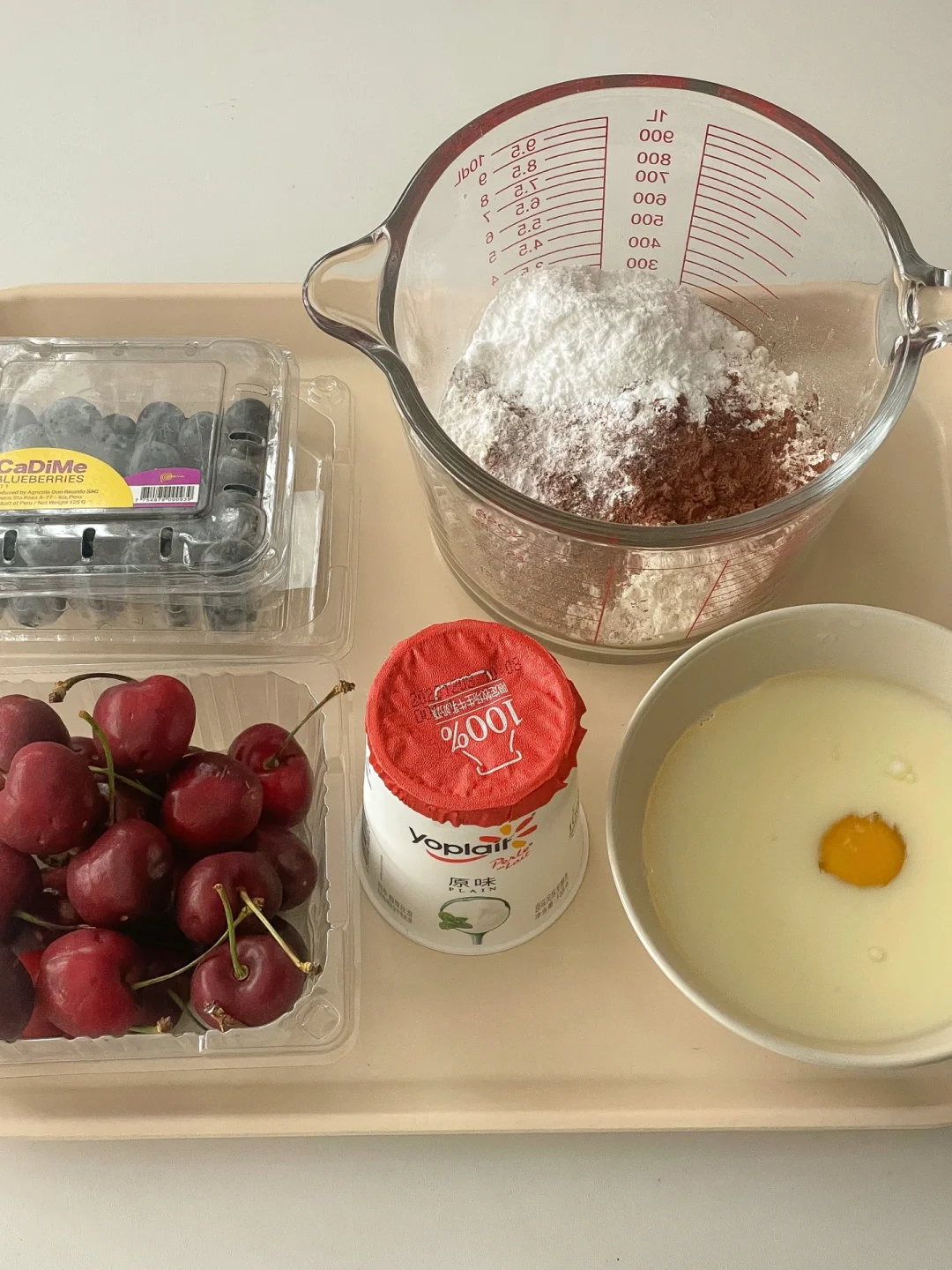 在松饼表面淋上厚厚的酸奶,搭配车厘子yyds!
