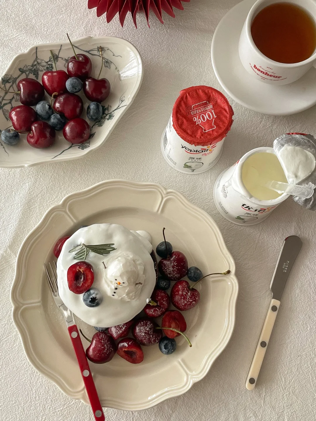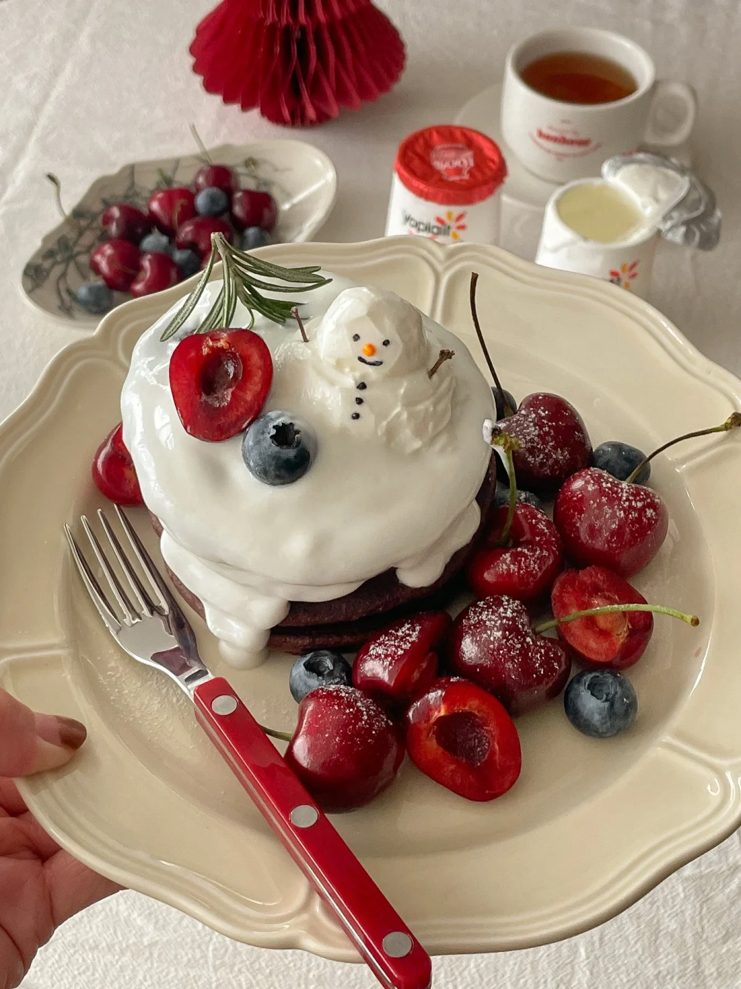 5️⃣煎好的松饼叠在一起后淋上酸奶摆上车厘子就可以啦