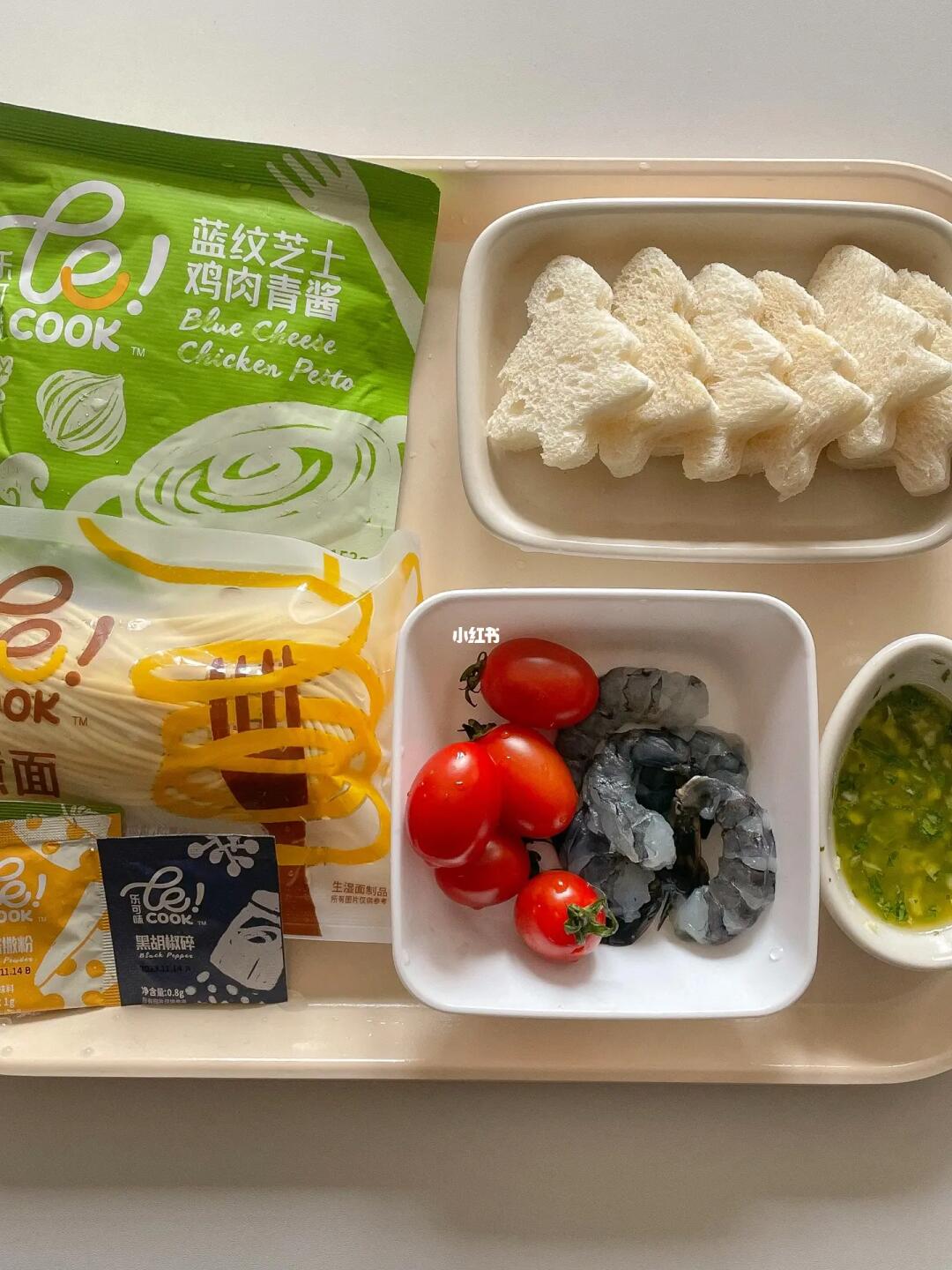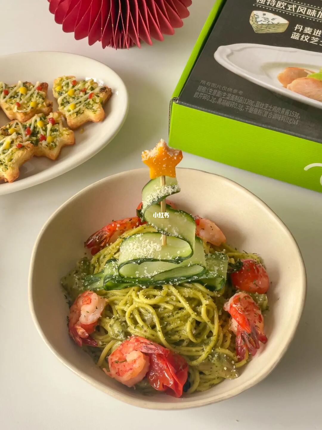4️⃣用胡萝和青瓜做成成圣诞树的样子,意面煮好后盛起来,加入大虾和小番茄,上面在插上圣诞树,撒上干酪粉和欧芹碎就可以啦