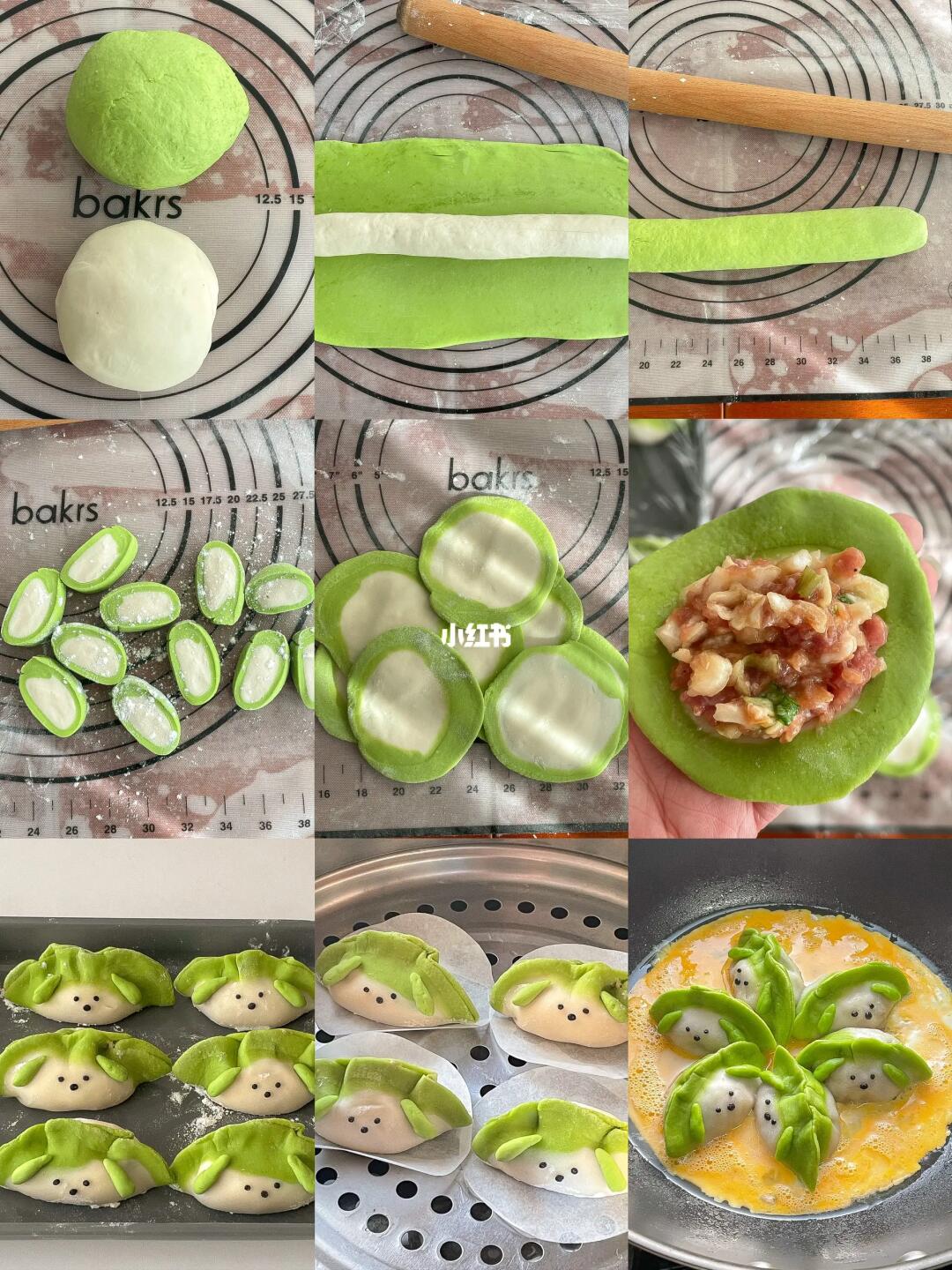 3️⃣面团醒发后稍稍揉一揉就很光滑,白色面团搓成长条,绿色面团擀薄后入白色面团封口捏紧,切成小剂子后擀成饺子皮