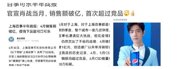 03另外,百事可乐近日发布了半年战报,官宣肖战当月,销售额破亿,首次超过竞品。讲真双方的竞争由来已久,说百事屡败屡战也不为过。有时很多事情不成功,不是不努力,也不是缺乏积累,就是缺少一个契机,缺少一个破局者。而肖战无疑就是这样一个人。官宣肖战代言是在4月,正是YI情严重的节点,品牌们都绞尽脑汁营销,效果不可谓不好,但在肖战强大的影响力和超强的带动力面前就不够瞧的了。官宣月逆势破亿,一举破局,冲破瓶颈,且4月,5月都超过竞品。可以说胜利局面已经打开,而肖战居功至伟,功不可没。希望后续品牌给力,再接再厉,再创佳绩。