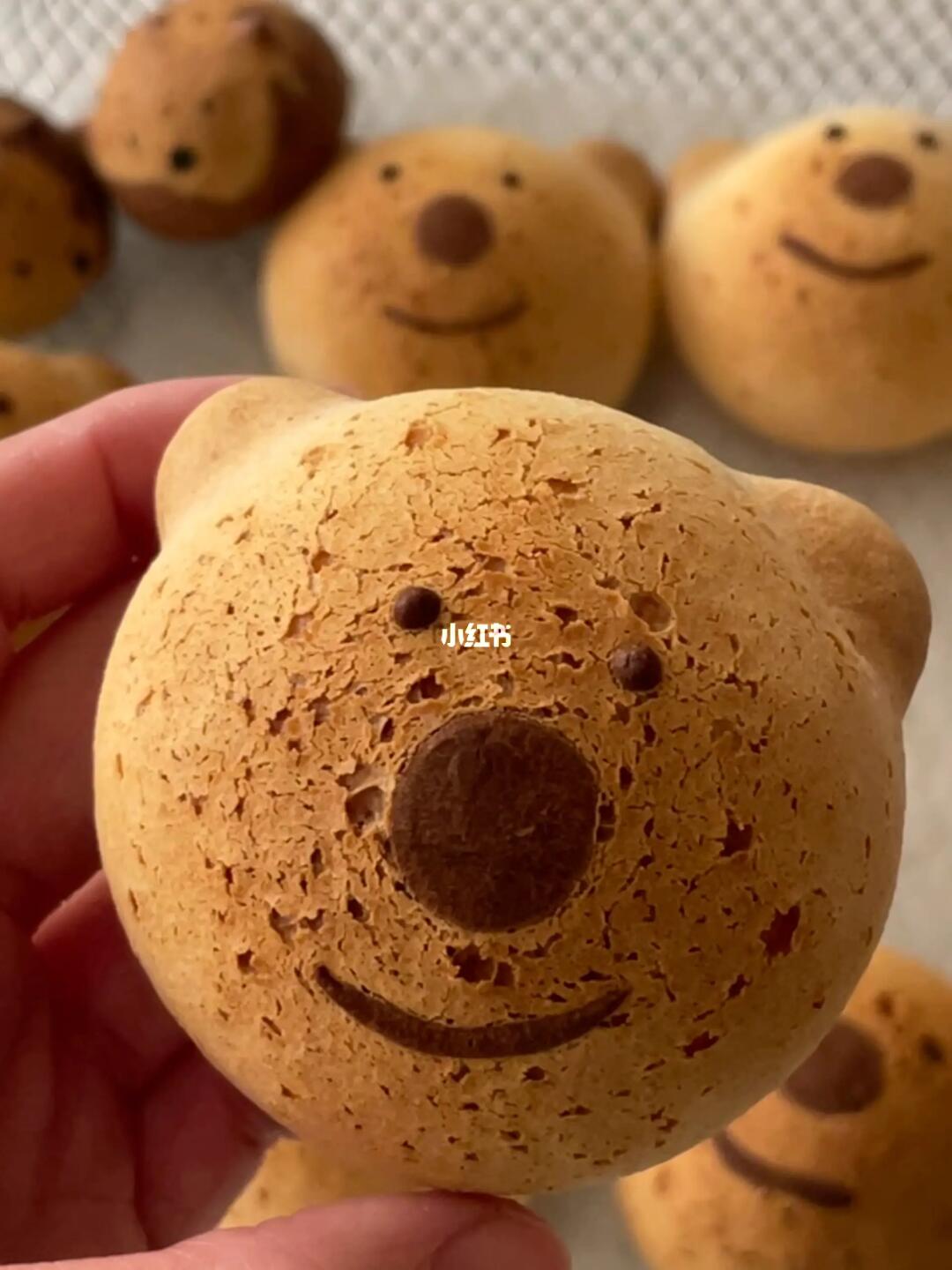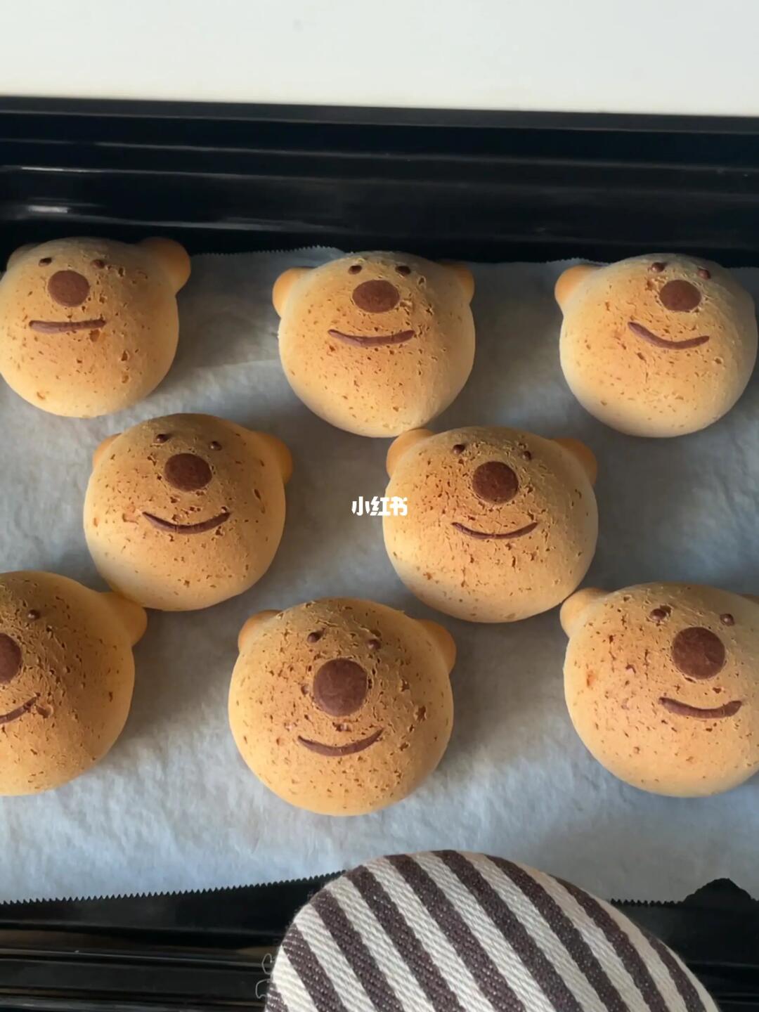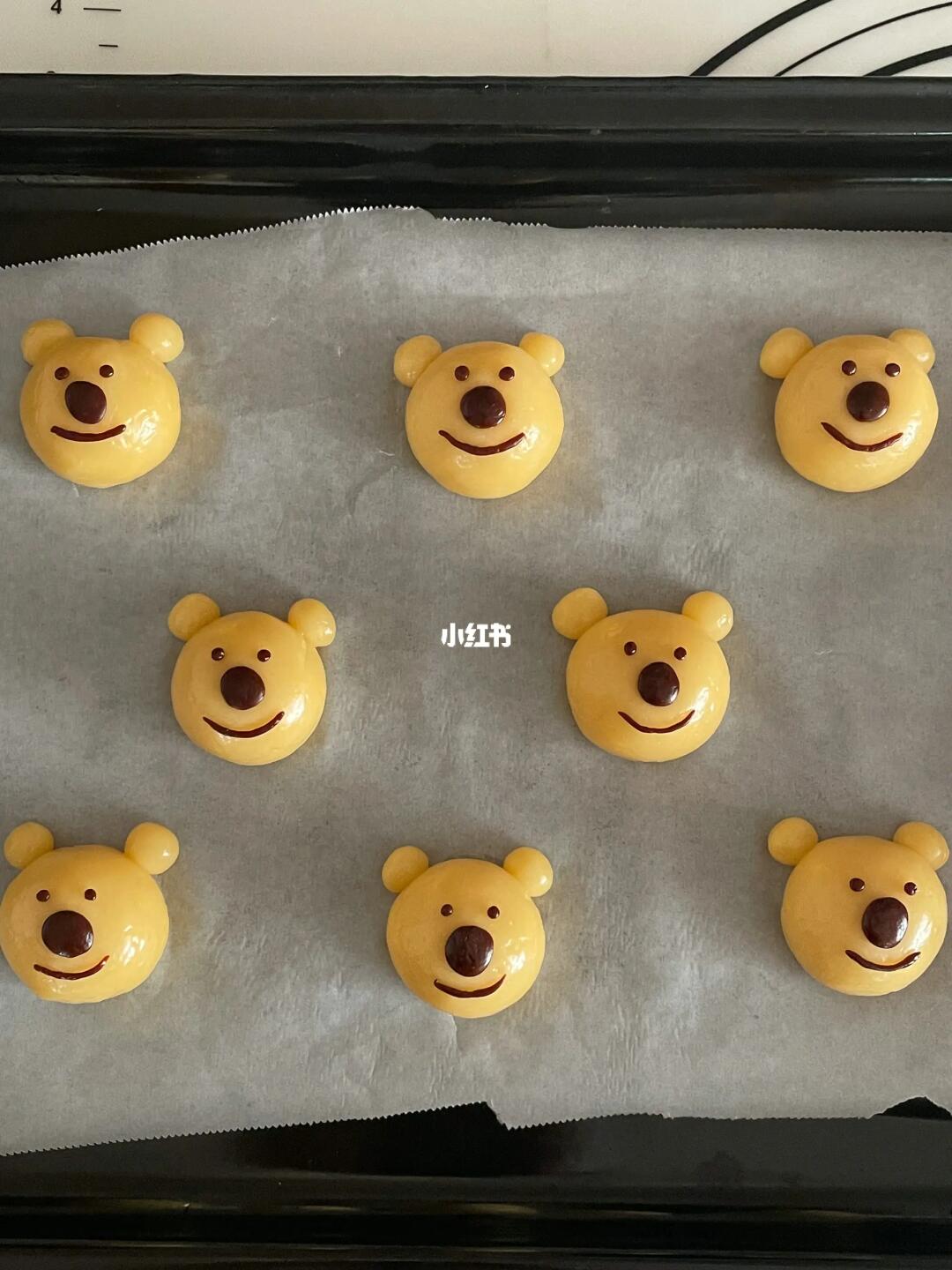 5️⃣面团分一小块出来加入可可粉作为鼻子眼睛嘴巴,再分一小块原色出来作为耳朵,剩余的面团分成25g每个