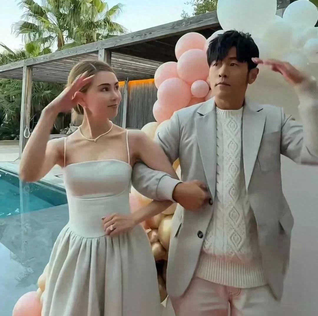 周杰伦则一身休闲装扮,手捧鲜花,脸上洋溢着幸福的笑容。