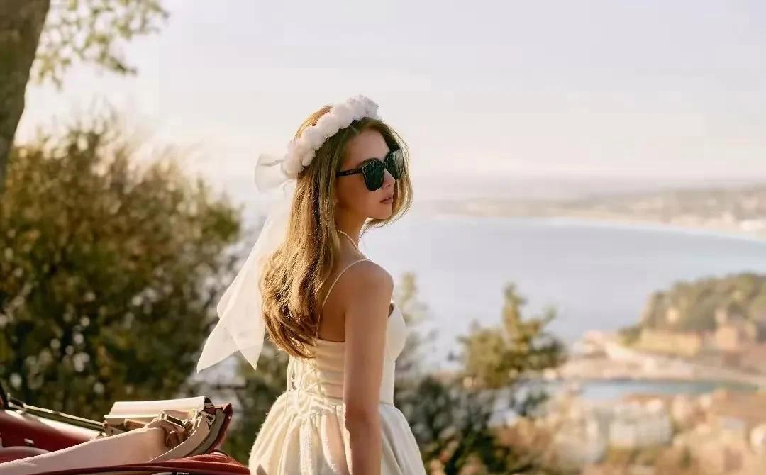 当天,昆凌穿着一条白色的长裙,头戴轻盈的头纱,在阳光下显得格外迷人。