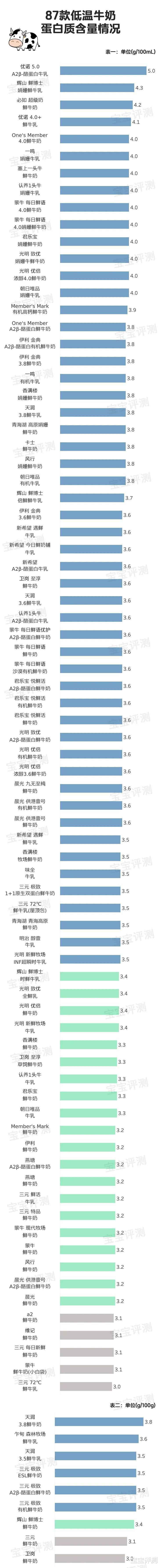 5、从蛋白质的整体含量上来看,与此前笨爸爸对比的常温纯牛奶相比,87款低温牛奶每百单位的平均蛋白质含量略高0.1g左右。