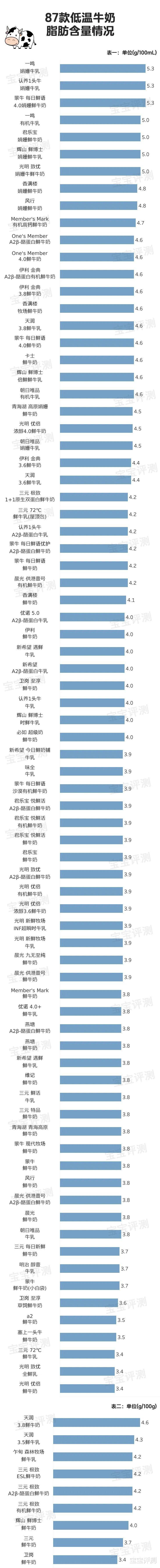 2、87款低温牛奶的脂肪含量在3.4—5.3g/100mL(100g)之间,其中,一鸣娟姗牛乳、认养1头牛娟姗牛乳、蒙牛每日鲜语4.0娟姗鲜牛奶,脂肪含量超过了5.0g/100mL。