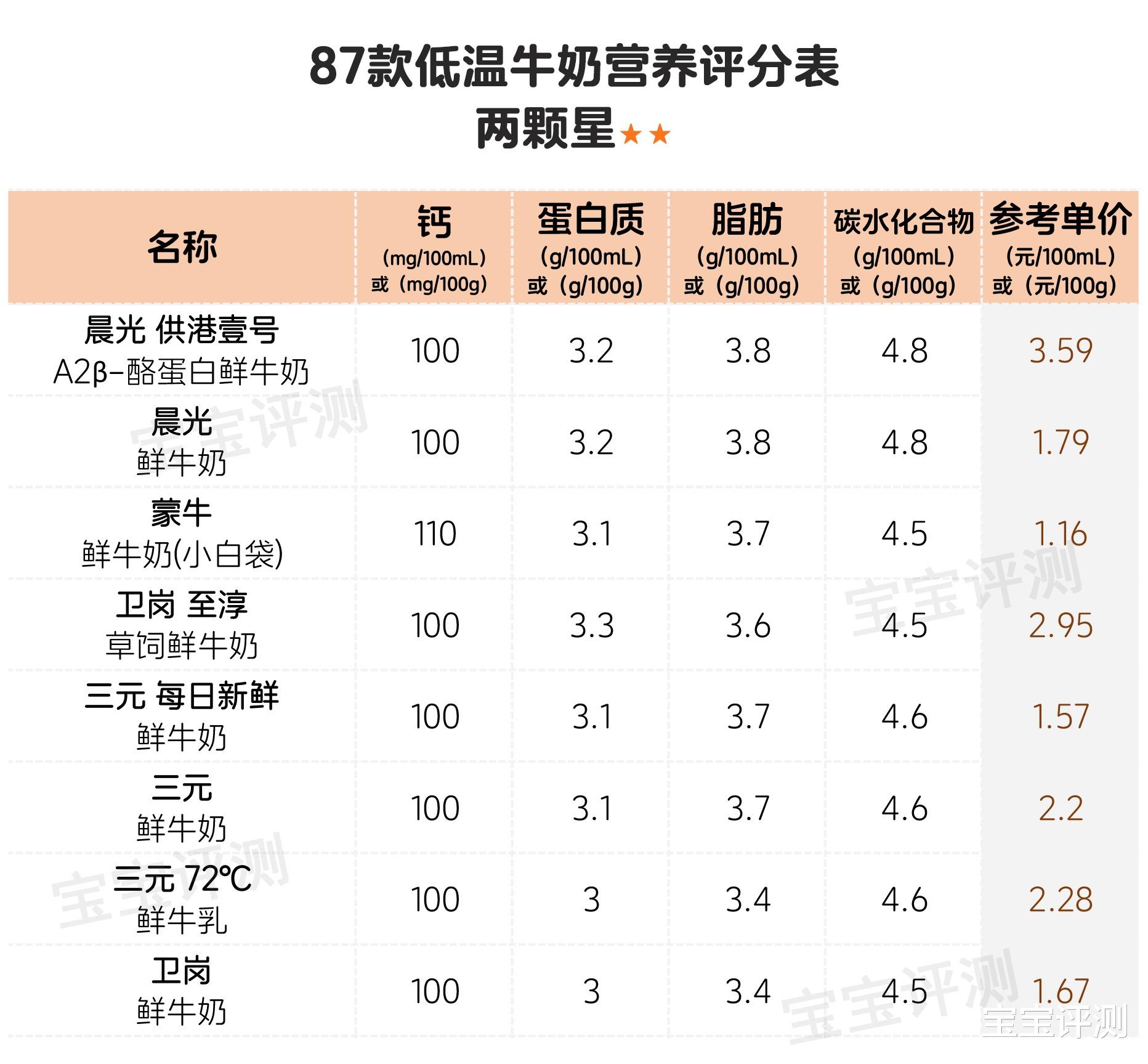 8款“两颗星”低温牛奶,钙平均含量约101mg/100mL,蛋白质平均含量约3.1g/100mL, 脂肪平均含量约3.6g/100mL,碳水化合物平均含量约4.6g/100mL。“两颗星”低温牛奶的平均单价约2.1元/100mL。