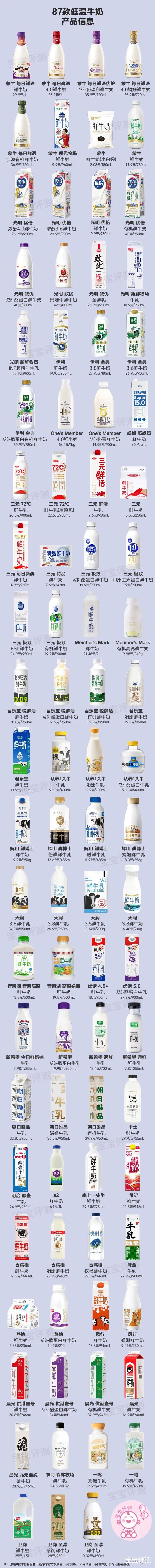 横评产品综合电商平台销量、品牌知名度和关注度,本期低温牛奶横评共选择了87款产品,包括以下品牌: