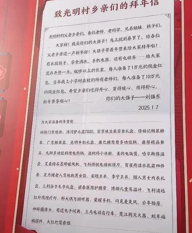 刘强东还亲笔写了一封拜年信,落款“你们的大强子”,用最接地气的方式传递对乡亲们的真挚情感。