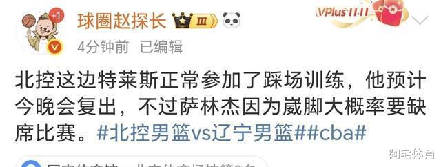 辽宁男篮随队记者透露:通过上午赛前适应性训练观察,预计参赛名单人员调整幅度不小;同场对手北控男篮情况同样不容乐观,受队员状态影响,可能被迫启用单外援阵容应战。