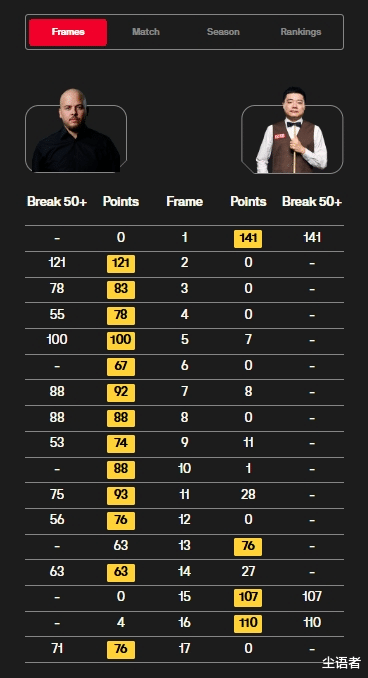 然而,这届世锦赛的对决,布雷切尔却给了丁俊晖一个耻辱纪录。第一阶段,虽然丁俊晖首局打得不错,直接打出单杆141先下一城,但随后被布雷切尔连胜7局,以1-7结束第一阶段的比赛。第二阶段一开始,布雷切尔打出三杆50+连胜四局,一度将比分领先至11-1,丁俊晖也遭遇到了十一连鞭。好在,丁俊晖打入最后一颗黑球赢下第13局,才终止连败,布雷切尔单杆63分12-2率先拿到赛点,随后丁俊晖打出107、110接连挽救两个赛点,以4-12结束本阶段。第三阶段,对于大比分落后这么多的丁俊晖来说,无疑是煎熬,而布雷切尔也没有让比赛持续多久,第三阶段只打了一局比赛。首局打出单杆50+拿下比赛,直接13-4晋级8强。