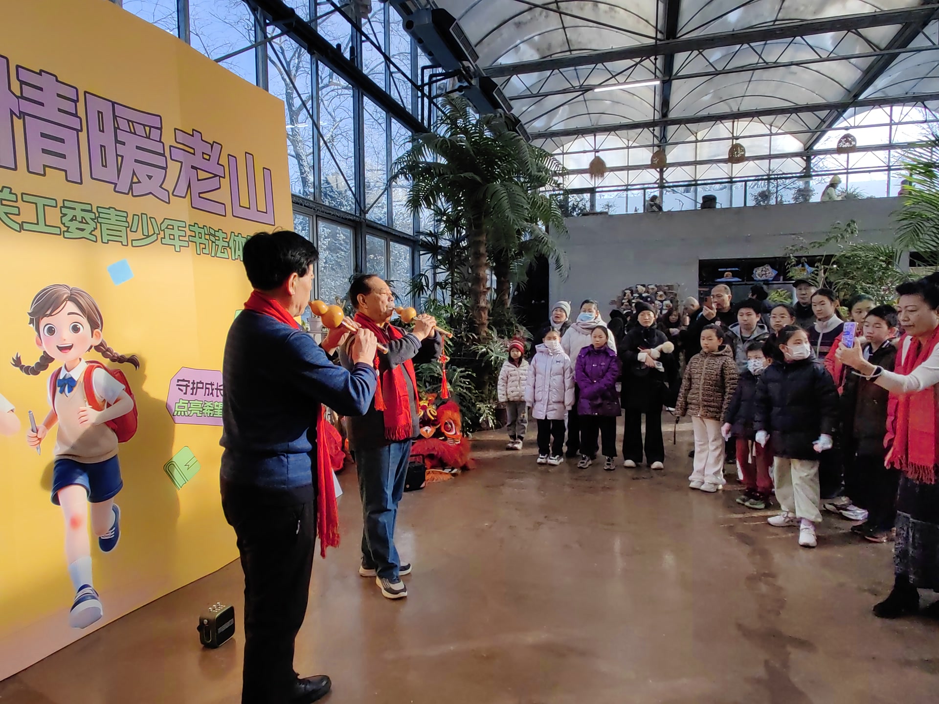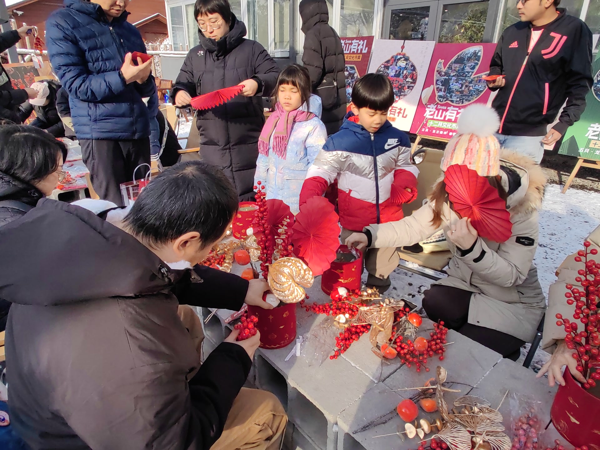 室外林下区域热闹非凡,“糖绘丰年”非遗糖画摊位前,居民们驻足观看糖画艺人巧手翻飞,区、街关工委领导与青少年一同体验,将甜蜜与祝福凝于一勺糖浆之中;“祥环盈门”花环编织区,大家用松枝、红果、福牌等材料亲手制作寓意吉祥的门挂花环,共同感受传统手作的魅力;“漆彩华灯”体验则带领参与者感受大漆工艺的魅力,将传统灯笼装点成独一无二的新年信物,在互动中传承文化基因。
