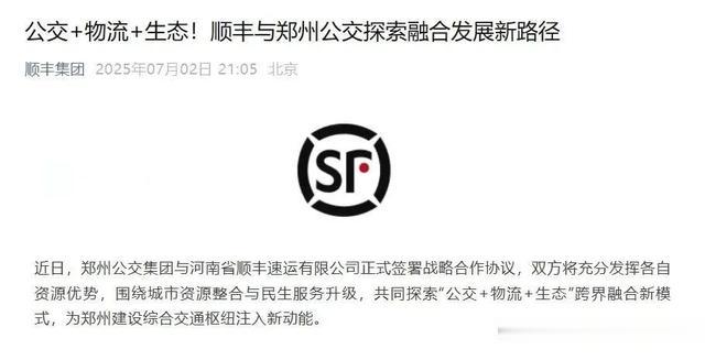 7月初顺丰官宣与郑州公交达成战略合作,共同探索“公交+物流+生态”跨界融合新模式。