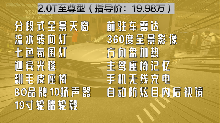 再往上看,2.0T的至尊型,比豪华型又贵了2万。配置方面继续锦上添花,有了分段式全景天窗,流水转向灯,七色氛围灯,迎宾光毯,还有了翻毛皮座椅,BO品牌的10扬声器,19寸轮胎轮毂,以及前驻车雷达和360度全景影像。配置上,绝对没啥毛病,但是价格上贵了2万。这差价,还是让很多人都望而却步的。毕竟算上优惠,现在这车落地要19万多了。