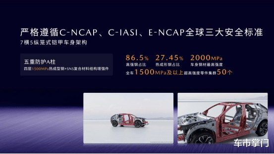 卓越的碰撞成绩来自于车身结构的创新。EZ-60采用7横5纵的笼式铠甲结构,高强钢占比86.5%,热成形钢27.45%,最高强度2000MPa,全车1500MPa及以上超高强度零件集群50个,关键部位更是层层加码,如A柱采用五重防护结构,内外双层1500MPa热成型钢和腔体SNS复合材料,大幅增强A柱的钣金强度和刚度,抗弯性能提升44%。