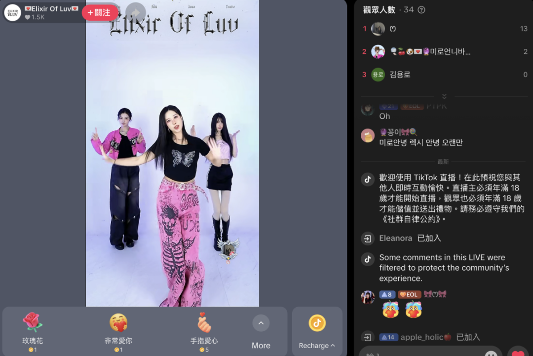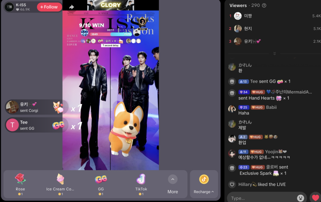 对比东南亚、日本等直团播直播间,韩国TikTok团播极度依赖单一“大佬”氪金,多维度上票普遍相对困难。根据音乐先声观察,即便是在团播高峰时间段如晚上6点以后,韩区团播直播间男团维持在百人以上,女团则将将过百。