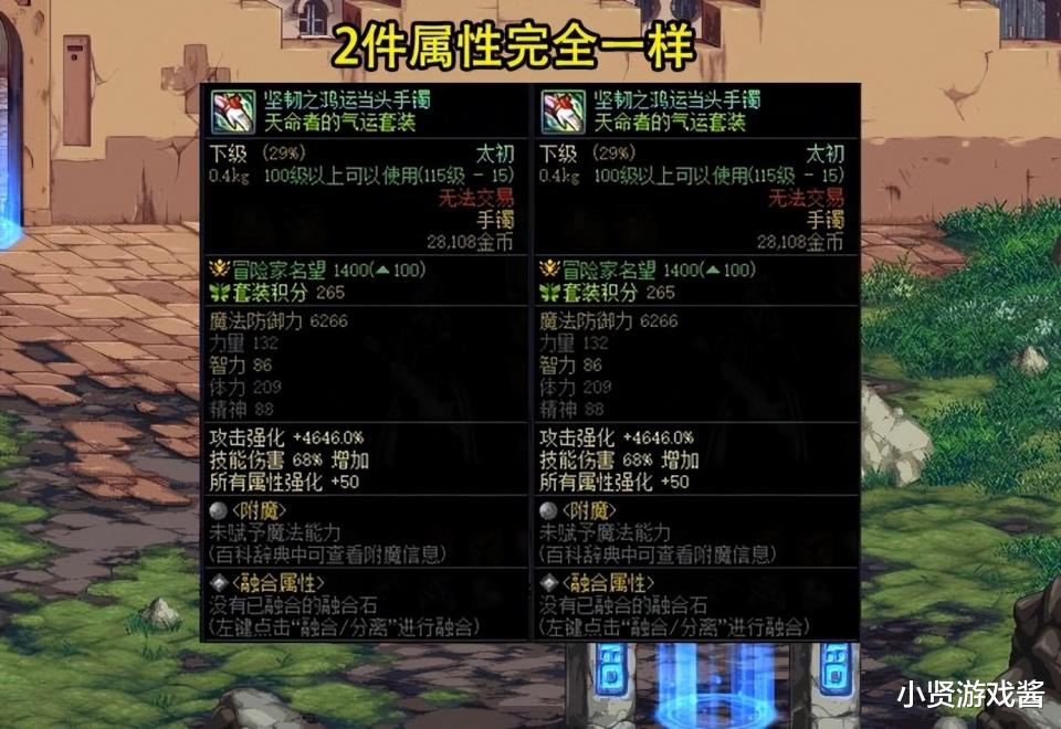 但更让他欲哭无泪的是,这两件手镯的属性居然是一模一样的,如图所示,品级都是29%不说,四维的属性都是132、86、209、88,非常的神奇,对此旭旭宝宝也是不禁吐槽,居然给自己搞上复制了。
