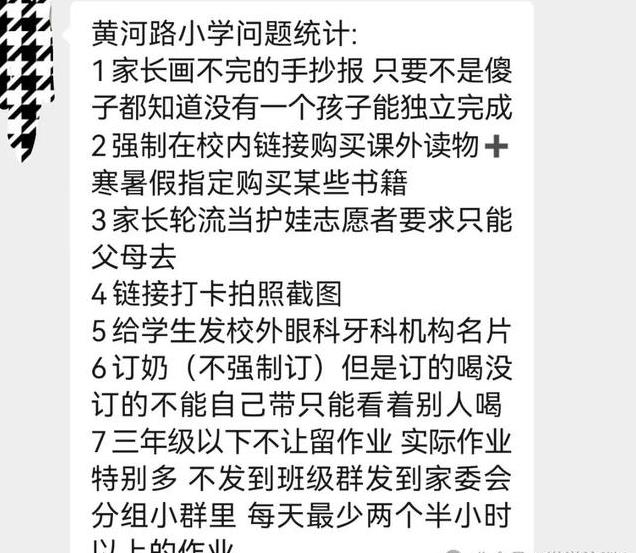 黄河路小学问题统计:1家长画不完的手抄报 只要不是傻子都知道没有一个孩子能独立完成2强制在校内链接购买课外读物寒暑假指定购买某些书籍3家长轮流当护娃志愿者要求只能父母去4链接打卡拍照截图 5给学生发校外眼科牙科机构名片6订奶(不强制订)但是订的喝没订的不能自己带只能看着别人喝 7三年级以下不让留作业 实际作业特别多 不发到班级群发到家委会分组小群里 每天最少两个半小时以上的作业。