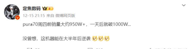 关键是上周四之前还是950W+,没想到因为网友的“一气之下”,导致Pura70的销量一夜暴涨50万台。