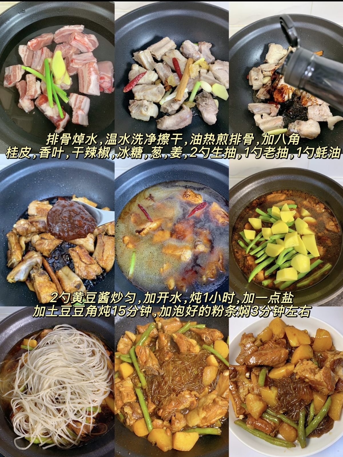 制作这道菜,选材是奠定风味的基础。排骨最好选用中排,肉质鲜嫩且带有一定的骨髓,炖出来更香。将排骨剁成均匀的小段,用清水反复冲洗,再浸泡半小时,以去除血水,这样炖出的汤汁才会清澈不腥。土豆则建议选用黄心土豆,口感更面更沙,去皮后切成滚刀块,备用。粉条的选择也很关键,红薯粉条为佳,它耐煮且吸味,用温水提前泡软,能避免在炖煮时碎裂。此外,准备姜片、葱段、八角、桂皮、香叶等香料,它们是激发食材本味的秘密武器。