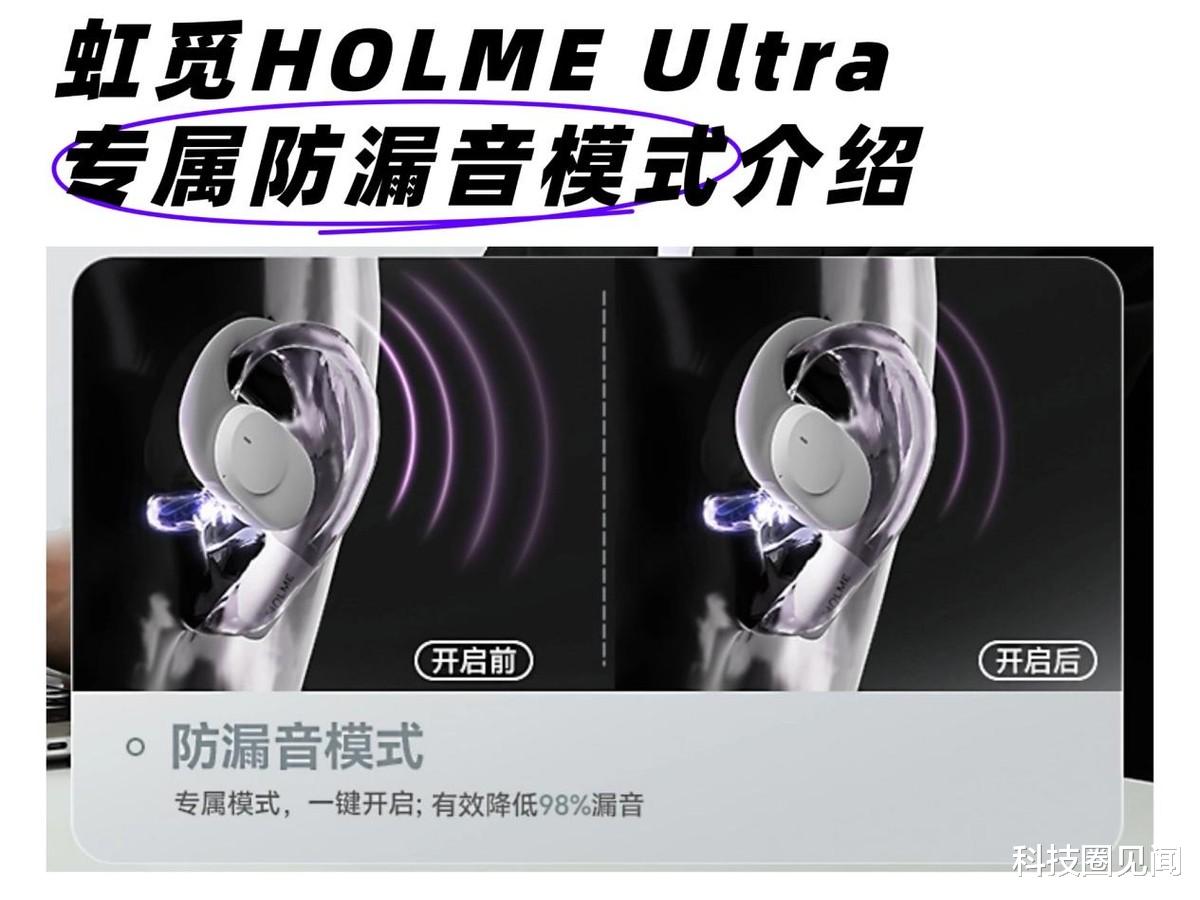 性能配置:虹觅Ultra采用的是创新的触片式充电,改良了传统触点式充电方式的接触不良,回仓不断连,充电慢的问题。为了解决开放式耳机的漏音问题,耳机还加入了专属防漏音功能,开启功能后可以明显地降低漏音外泄的问题。配置上拥有蓝牙5.4芯片,内置四麦高清麦克风,支持ENC通话降噪,支持IPX6级防水,智能一拖二,单耳续航8小时,综合续航32小时。可以说是目前500元以下的怪物级别的配置。