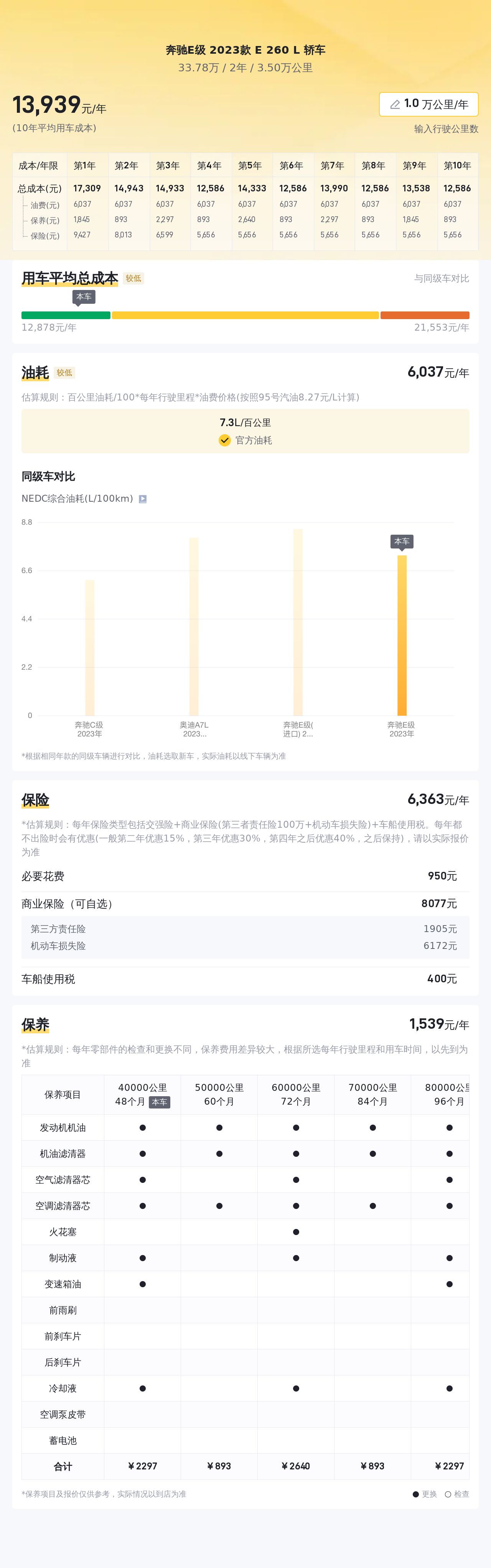 这款二手奔驰E级,按照每年2万公里行驶里程计算,10年平均用车成本约21105元/年,其中油费约14160元/年,保险费用约6088元/年,保养费用约1957元/年。油费和保养费用与同级别竞品车型相比较有优势。