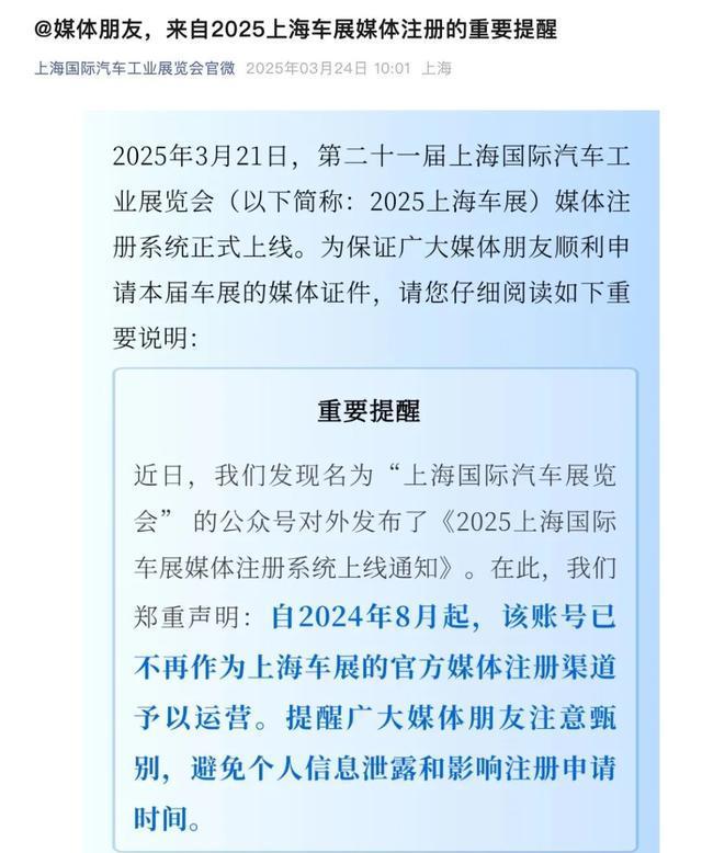 这一波操作让所有媒体都更摸不着头脑了。之前呢,“上海国际汽车工业展览会”的官方微博在3月20号就说了,2025上海车展的媒体注册,3月21号就能开始申请了。结果隔了一天,也就是3月21号,“上海国际汽车展览会”又发消息,说2025上海车展定在2025年4月23号到5月2号,在国家会展中心(上海)举行,其中4月23号和24号是专门给新闻媒体开放的日子。上海车展的主办方欢迎大家到时候来采访报道这次车展。
