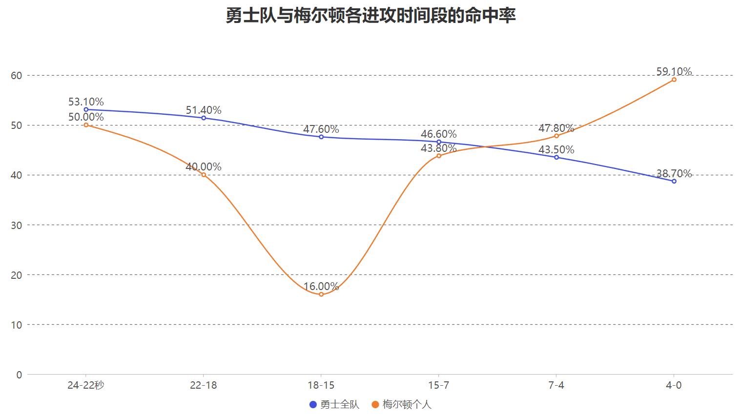 库里年龄问题也经常遭到对手围堵,巴特勒也是年龄并且现在还受伤,库明加还闹出内讧,只有梅尔顿没有各种问题可以自由发挥,而他除了这个难以替代性还具备其他的能力,在24秒进攻时间濒临结束的最后4秒,他有高达59.1%的投篮命中率远超勇士全队的水准,在勇士战术打不开时他有一锤定音的能力。