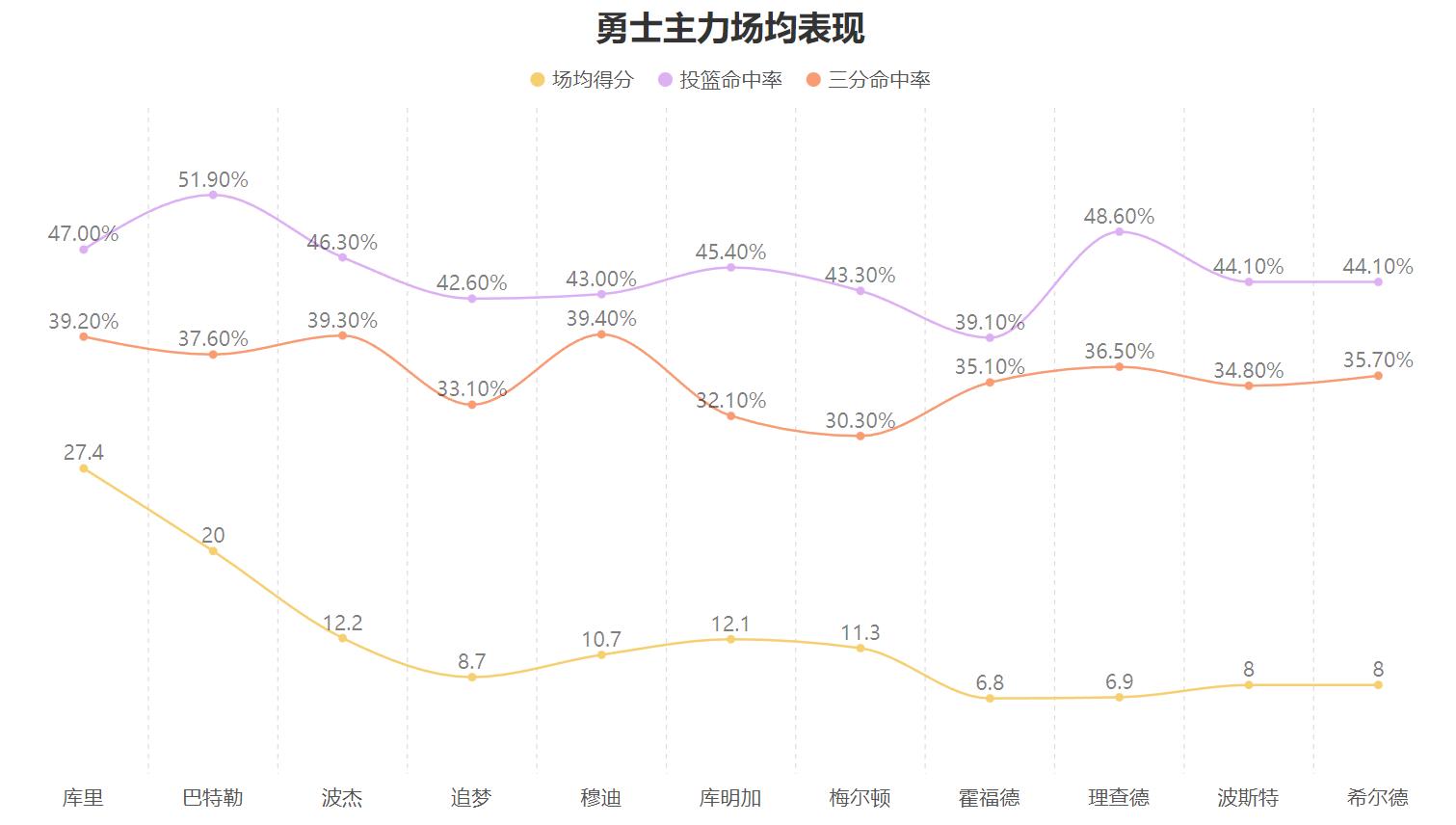 梅尔顿在对阵独行侠的比赛里贡献了22分,并且他+22的正负值更是勇士的全队最高,这意味着尽管勇士失利但梅尔顿在场时勇士是净胜独行侠的,但从场均表现来看梅尔顿真的不能算多么出众,本赛季他场均11.3分,两项命中率分别为43.3%与30.3%,场均2.7篮板+2助攻,这样的场均表现无论是数量还是得分效率都不能算多么强力,但若对比在场作用他却是极为夸张的:
