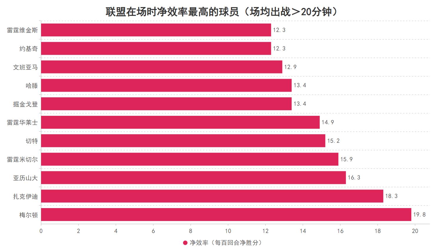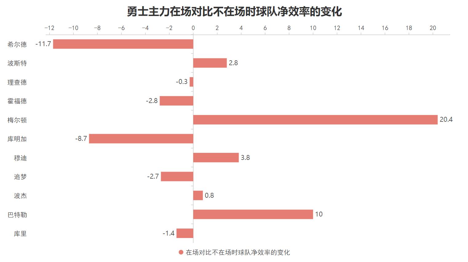 当梅尔顿在场对比不在场时,勇士的净效率也就是每百回合的净胜分会从负0.6提升到19.8,也意味着他的在场可以令勇士每百回合的净胜分提高20.4分之多,这个提升幅度在勇士场均出战20分钟以上的主力球员里高居第一并且断档式领先,即使在联盟也是最为顶尖的球员。
