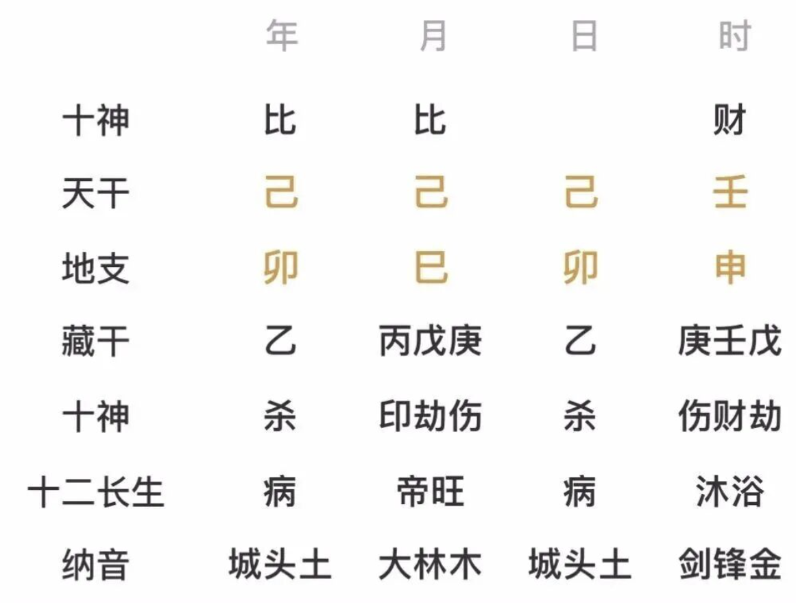 天干三个己土伏吟,比肩较多,时支申金为伤官来泄身,但巳申相合,申金有损,巳火印星当令,得卯木生扶较旺,性格上会有些固执,比较自我倔强,有的时候一根筋,加上己卯日出生,日坐卯木七杀,性格略正统保守,申金是虽然伤官泄身,但是被合克,也代表不太懂得变通,有的时候有些较真,缺乏全局观。