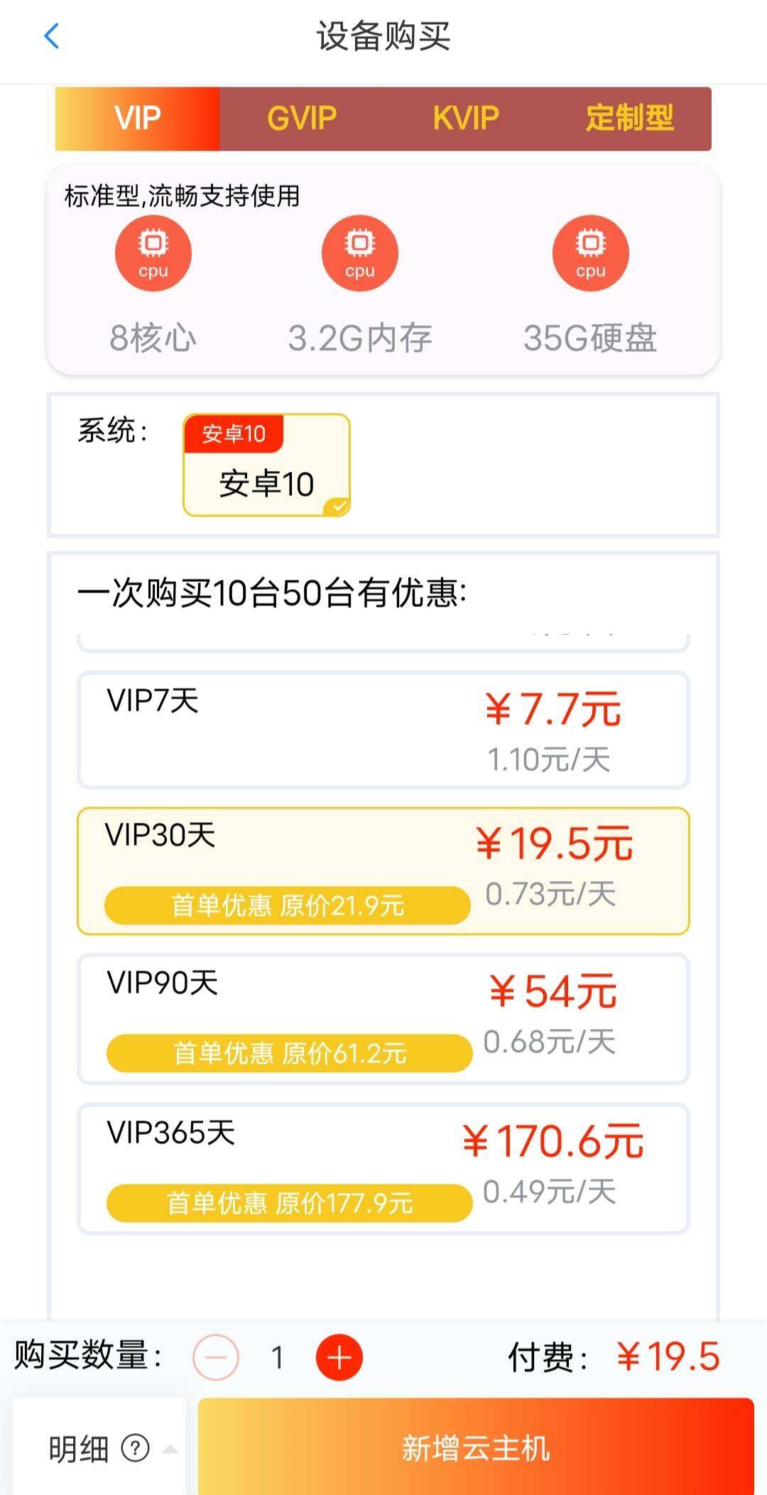 ACE云手机:它的安卓10VIP套餐月费才19.5元,价格很诱人,但配置短板太明显,运存只有3.2G,储存也才35G。3.2G的运跑跑轻量小游戏都勉强,更别说大型手游了,挂机时频繁出现卡死、闪退,贪便宜入手只会得不偿失。