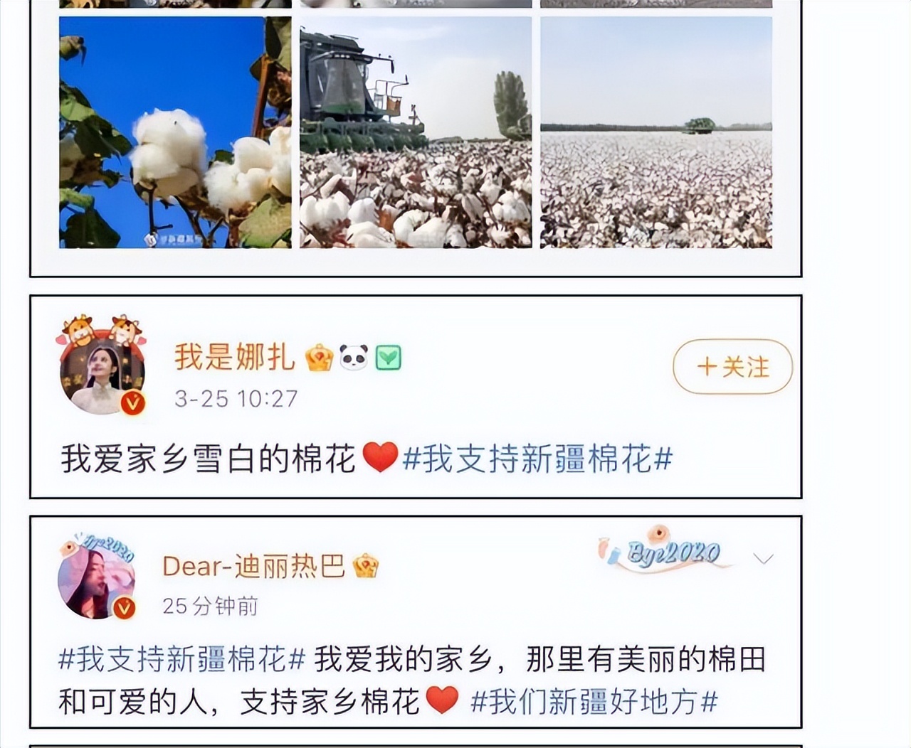 为了为新疆正名,我国许多来自新疆的明星,像是迪丽热巴、古力娜扎等人纷纷发文支持新疆棉花。