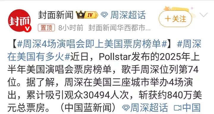 周深4场演唱会即上美国票房榜单消息,令人备受关注!原来,有媒体发文:最近,Pollstar发布的2025年上半年美国演唱会票房榜单,歌手周深位列第74位。这对于中国歌手来说,就是一种成功!因为,周深在美国进行演出,深受当地观众的支持与欢迎!