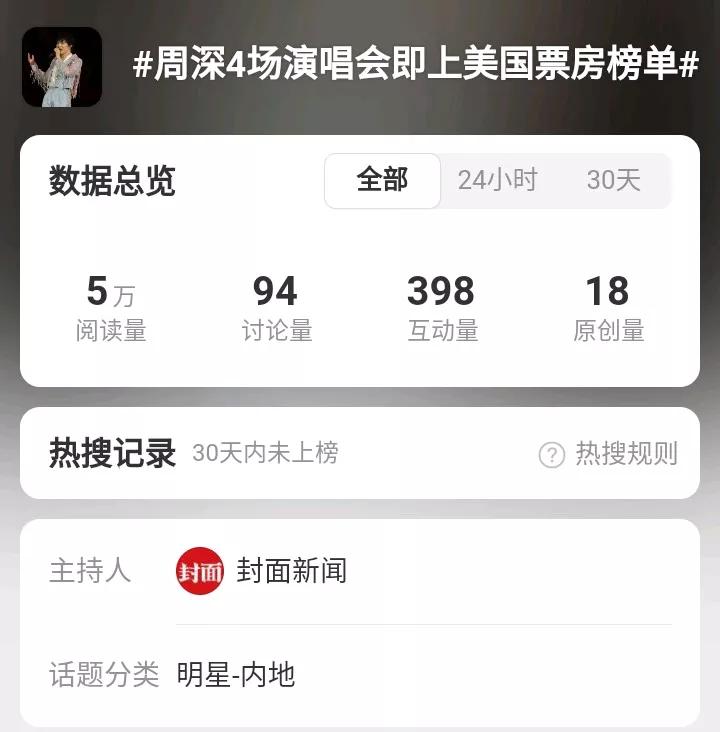 中国歌曲的文化影响力,由此在国外传播开来!事实上,歌手周深能够这样感人至深!也是他个人努力的结果!高人气,高关注度,还有高的喜爱度,才是观众对歌手周深的正向反馈!一时间,网友们纷纷关注“周深4场演唱会即上美国票房榜单”消息!这一话题阅读量达到5万!