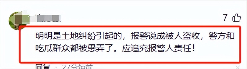 “明明是土地纠纷引起的,报警说成被人盗收,警方和吃瓜群众都被愚弄了。应追究报警人责任!”