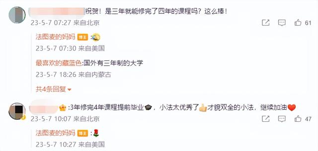对此,有不少粉丝就以祝贺的方式狂夸法图麦是学霸,说她三年就修完了四年的课程,真的太优秀了,才貌双全值得点赞。