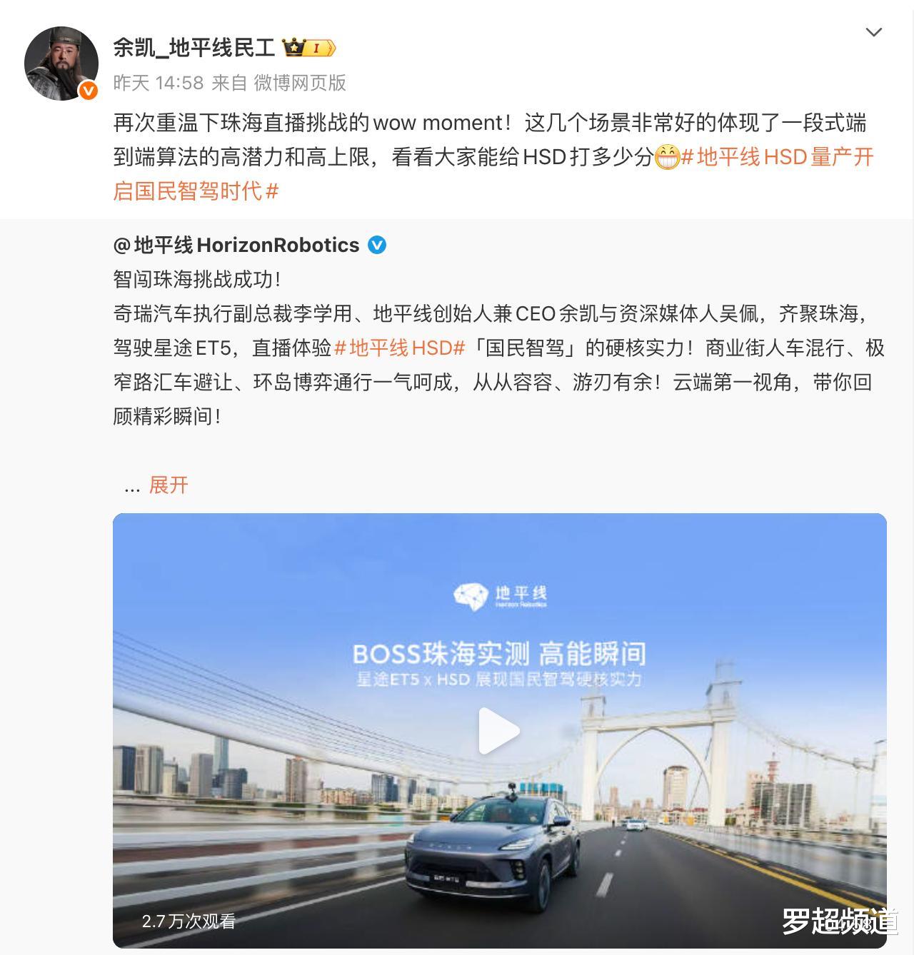 在星途ET5上市当天,奇瑞汽车执行副总裁李学用与地平线创始人兼CEO余凯在珠海进行了一场城市道路直播试驾。在直播中,面对密集车流、频繁加塞的车辆和不时出现的行人,这款试驾车却表现出了接近“老司机”的驾驶素养,从容完成减速、避让、跟车等操作。