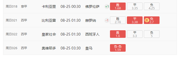018 卡利亚里+1胜 +026皇马半全场负负--------2.6倍左右