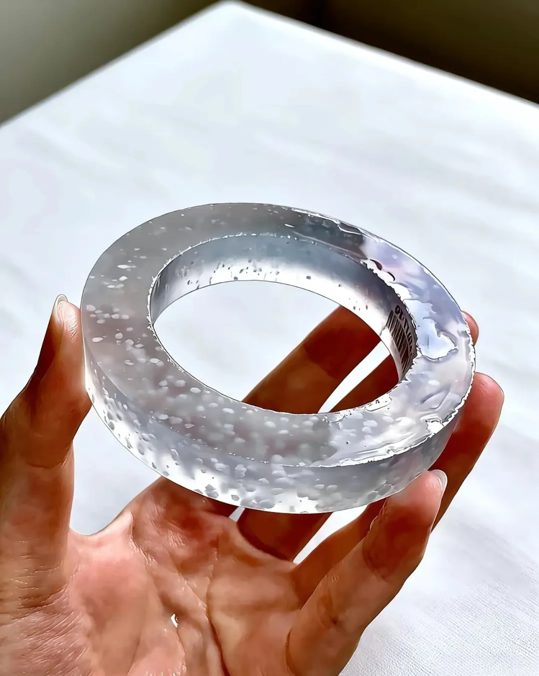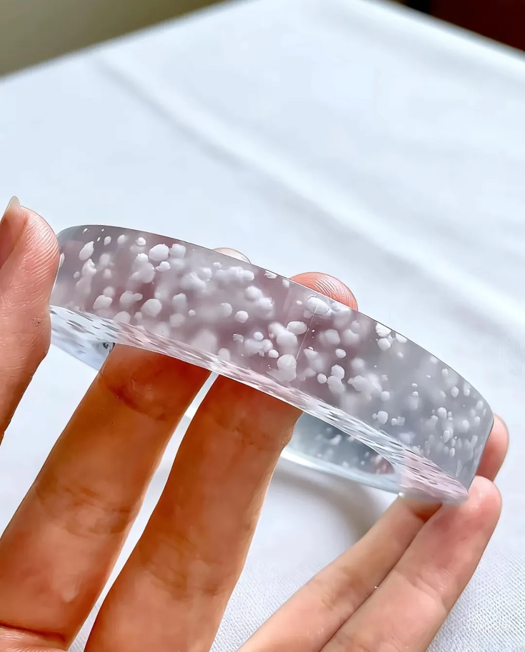 冰种雪花棉是翡翠中的一种特殊品类,可以从以下几个方面来形容: