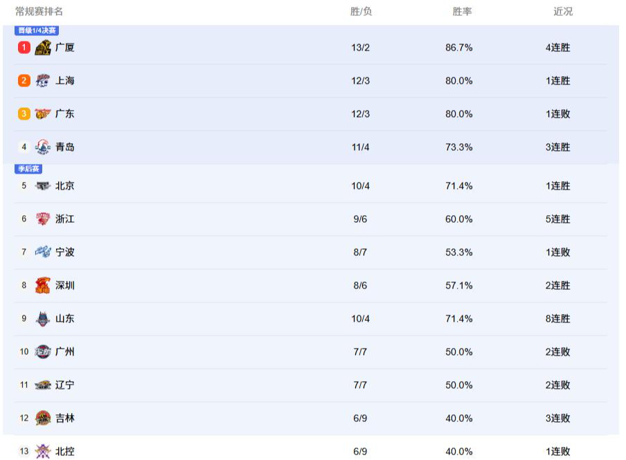 由于广东男篮大比分不敌上海男篮,广厦男篮已稳稳占据积分榜第一位,上海男篮与广东男篮并列第二,青岛男篮与北京男篮并列第四,曾经的三连冠王朝球队辽宁男篮则跌至第11位。