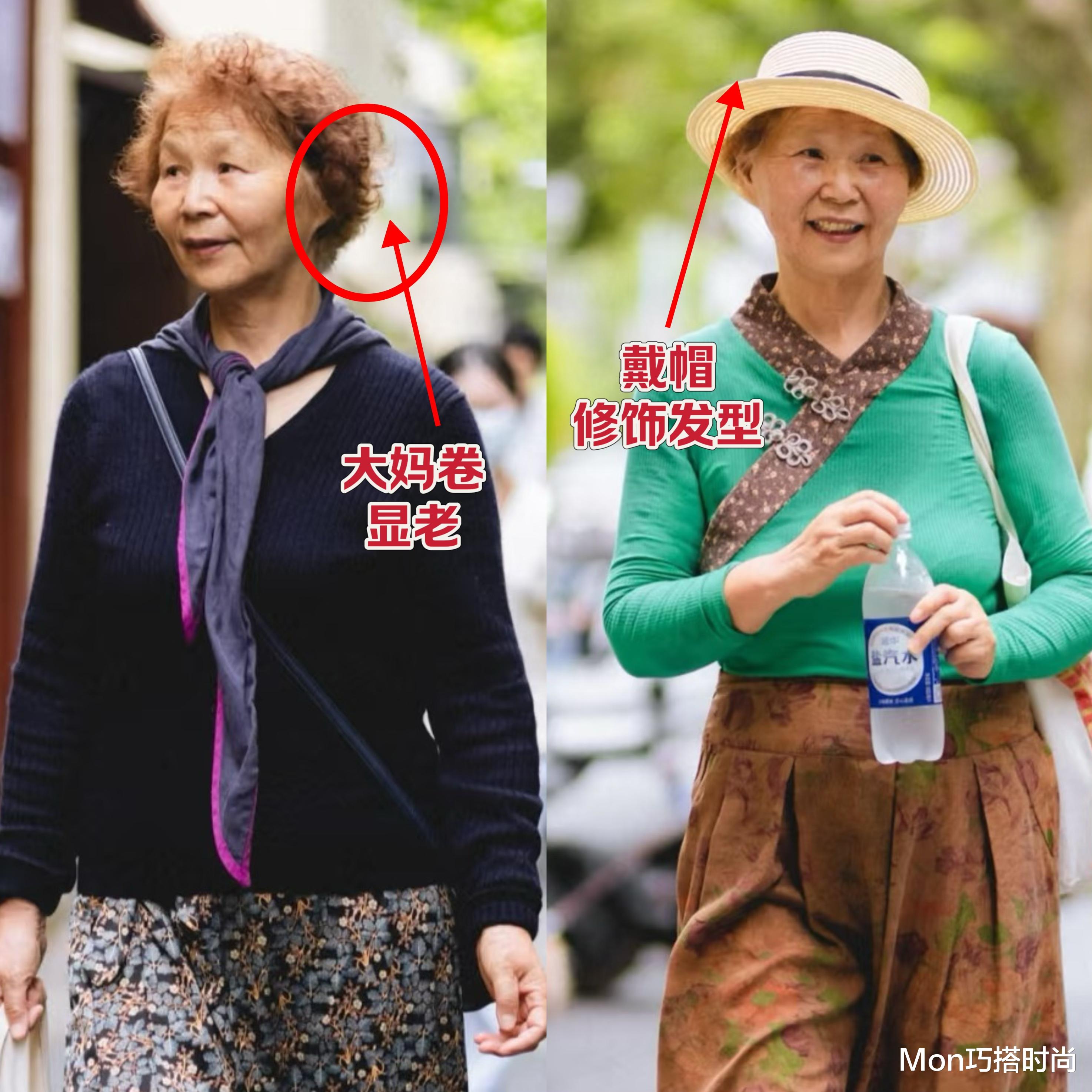 为什么要戴帽子?除了在冬季保暖,夏季防晒之外,戴帽子还有一个很大的作用,那就是修饰我们的发型,特别是好多白发奶奶跟风烫了大妈卷之后,开始后悔却又拯救不了,就可以靠戴帽子把我们乱糟糟的头发遮盖住,顺便增加搭配的时尚感。