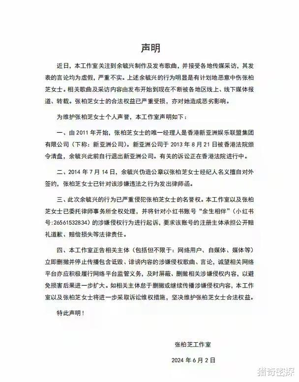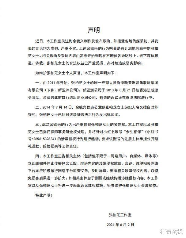两人的矛盾早有渊源:2014 年,余毓兴曾被指伪造公章替张柏芝签约;2024 年 6 月,他发新歌时公开吐槽张柏芝 “博同情” ,张柏芝工作室随即发声明维权。