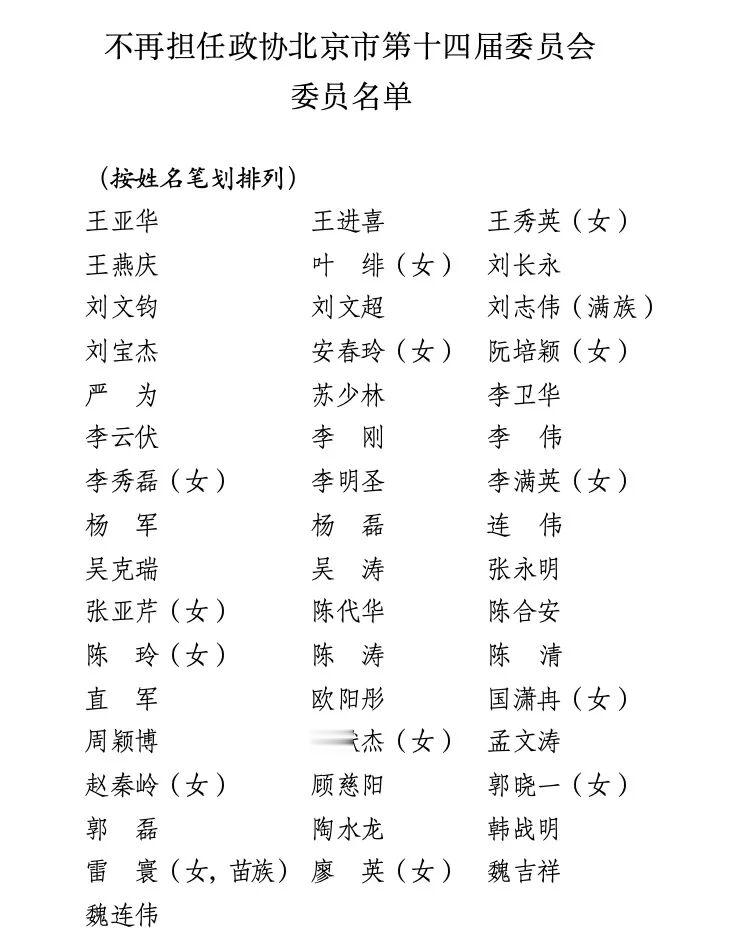 会议协商讨论了中共北京市委、北京市各民主党派、无党派人士和各人民团体的联合建议书,决定予以接受。由于任职年龄和职务变动等原因,王亚华等49名同志(名单附后)不再担任政协北京市第十四届委员会委员。