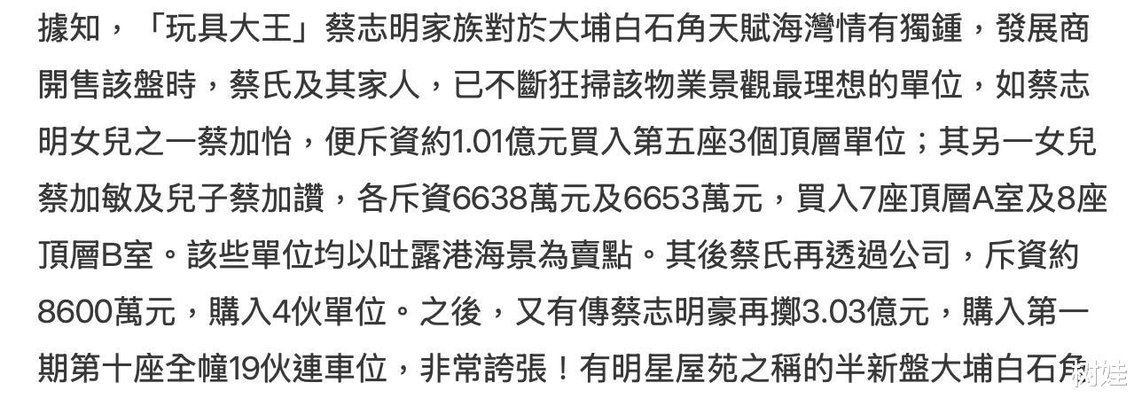 当然,蔡志明家族狂买天赋海湾的房产并不是用来自住,这想也知道,更多就是用来投资或出租,从汪圆圆晒出的照片来看,这房子几乎都没什么烟火气,也就是说根本看不出有住过的迹象,顶多偶尔就是来此处看看风景,拍拍照,没准汪圆圆此次就是顺道而来,打个卡,拍个照而已。事实上,很多富商买房都不是自住,他们有自己固定的居所,而超级富豪们更是如此,他们喜欢住的是山顶的独栋大宅。还值得一提的是,天赋海湾这个大型楼盘称得上是明星楼盘,很多香港艺人都在此买房,比如林晓峰、陈小春、王祖蓝、胡杏儿等等,可见此地风水,风景都极好。