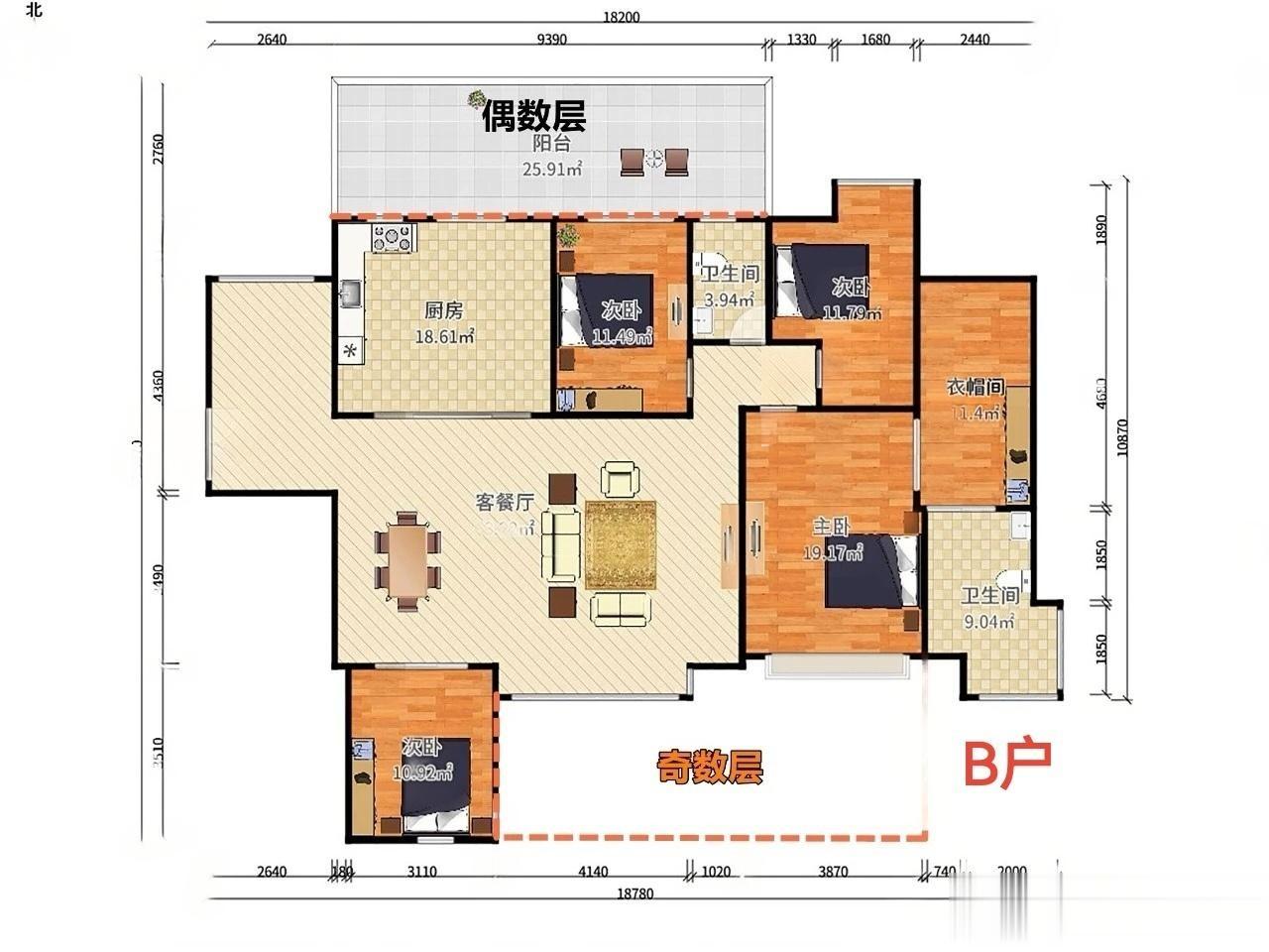 B户型163平,这种户型也是位于6、7栋,共42户,原始户型是四房,也有改成五房,而且改动效果还很好,有单数层和双数层区分,单数层东南向阳台,双数层西北向阳台,使用面积约182平方含入户花园。