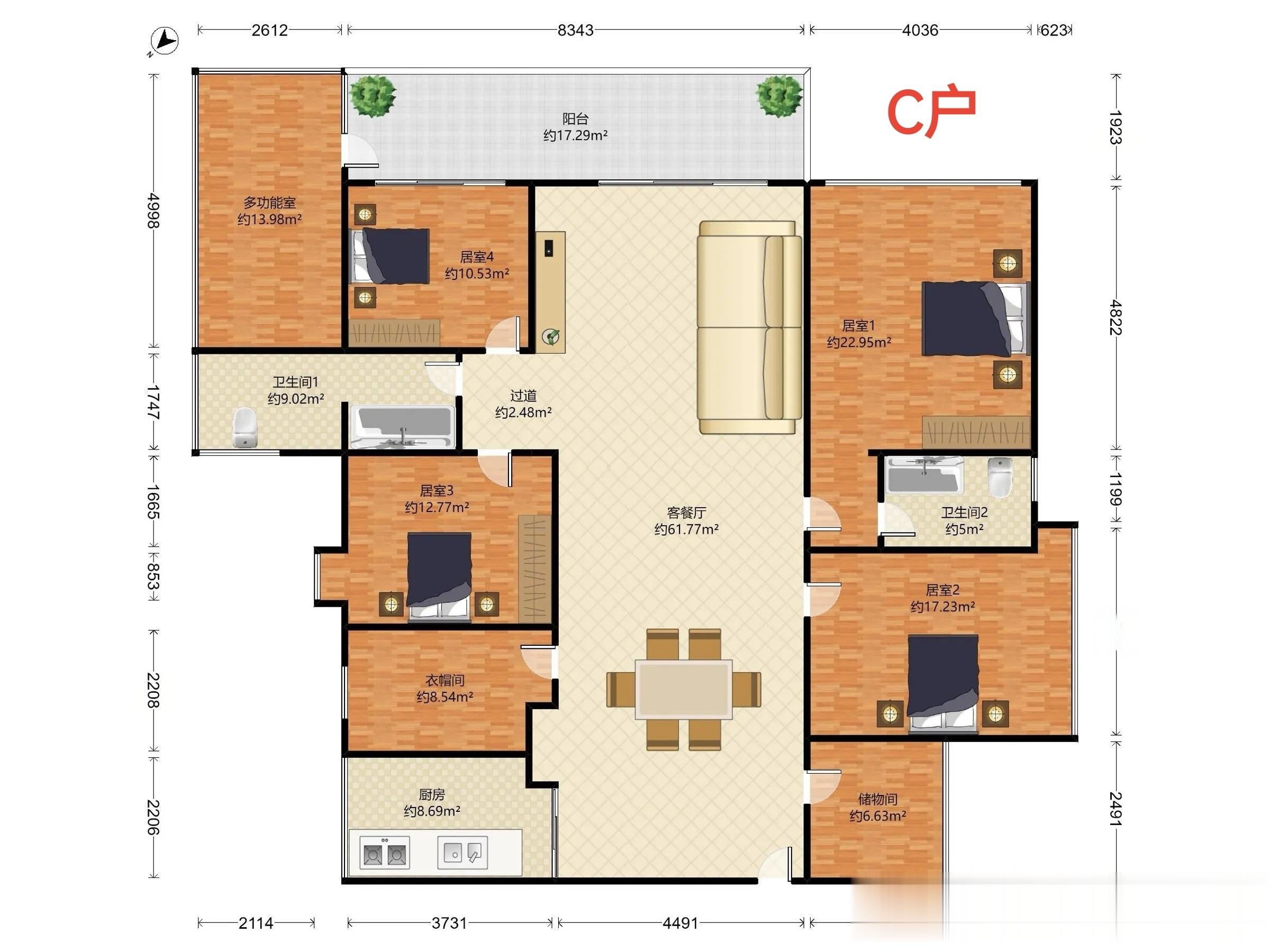 C户型173平,这种是位于6、7栋的凸出位置,三面采光,转角大阳台,10楼以上就有很好的海景,而且海景面是维港5个户型中最好的,可以从春笋看到深圳湾大桥。这种户型单数层客厅出L形大阳台,连接次主卧,图中多功能室为阳台的一部分,属于后期封闭改造。双数层是主卧单独出L形大阳台,客厅是凸窗。